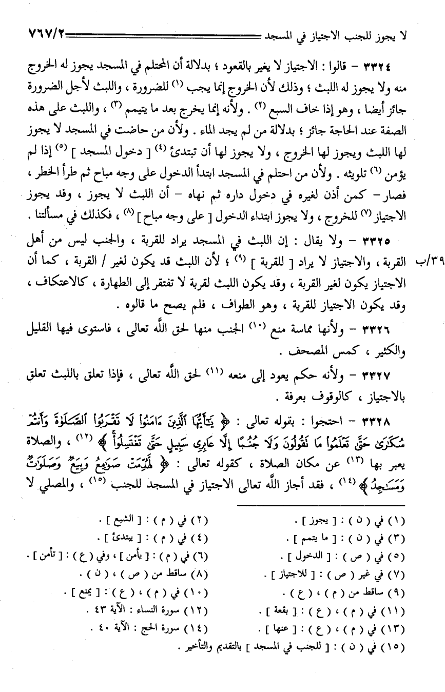 3328 - احتجوا: بقوله تعالى: {يا أيها الذين أمنوا لا تقربوا الصلاة وأنت سكارى حتى تعلموا ما تقولون ولا جنبا إلا عباري سبيل حتى تغتسلوا}، والصلاة يعبر بها عن مكان الصلاة، كقوله تعالى: {لهدمت صوامع وبيع وصلوات ومساجد}، فقد أجاز الله تعالى الاجتياز في المسجد للجنب، والمصلي لا