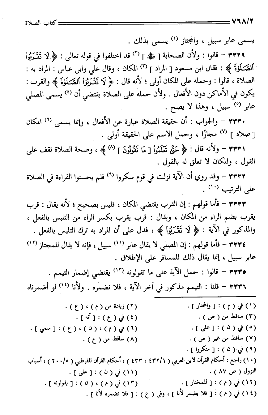 3329 - قالوا: ولأن الصحابة [- رضي الله عنهم -] قد اختلفوا في قوله تعالى: {لا تقربوا الصلاة} فقال ابن مسعود [المراد] المكان، وقال علي وابن عباس: المراد به: الصلاة، قالوا: وحمله على المكان أولى؛ لأنه قال: {لا تقربوا الصلاة} والقرب يكون في الأماكن دون الأفعال. ولأن حمله على الصلاة يقتضي أن يسمى المصلي عابر سبيل، وهذا لا يصح.