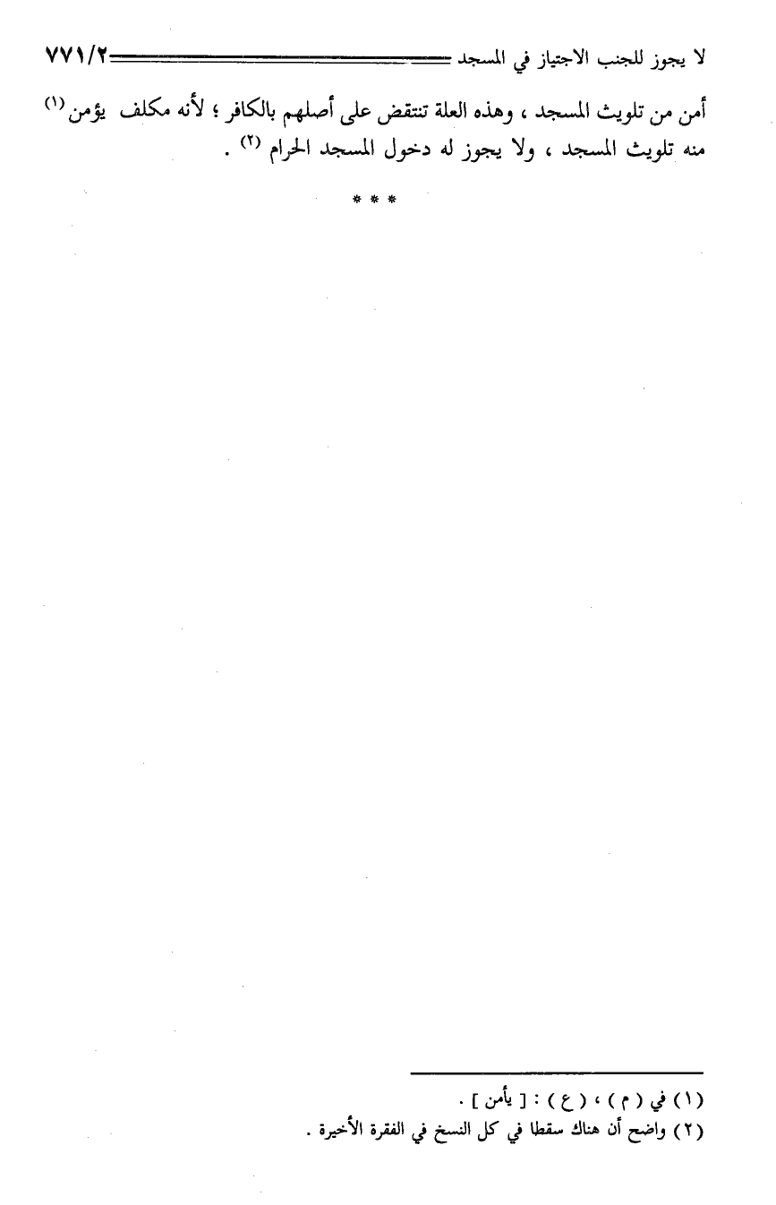 أمن من تلويث المسجد، وهذه العلة تنتقض على أصلهم بالكافر؛ لأنه مكلف يؤمن منه تلويث المسجد، ولا يجوز له دخول المسجد الحرام.