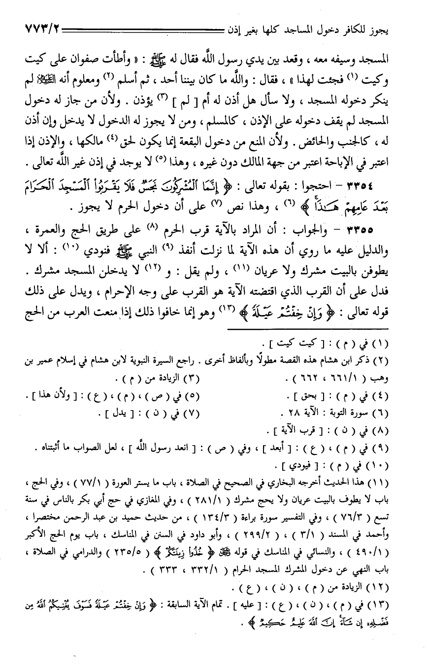 3354 - احتجوا: بقوله تعالى: {إنما المشركون نجس فلا يقربوا المسجد الحرام بعد عامهم هذا}، وهذا نص على أن دخول الحرم لا يجوز.