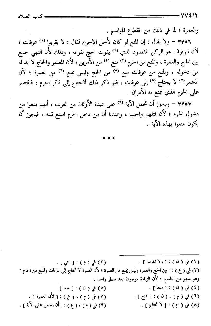 3356 - ولا يقال: إن المنع لو كان لأجل الإحرام لقال: لا يقربوا عرفات؛ لان الوقوف هو الركن المقصود الذي يفوت الحج بفواته؛ وذلك لأن النهي جمع بين الحج والعمرة، والمنع من الحرم منع من الأمرين؛ لأن المعتمر والحاج لابد له من دخوله، والمنع من عرفات منع من الحج وليس بمنع من العمرة؛ لأن المعتمر لا يحتاج إلى عرفات، فلو ذكر ذلك لاحتاج إلى ذكر الحرم، فاقتصر على الحرم الذي يمنع به الأمران.