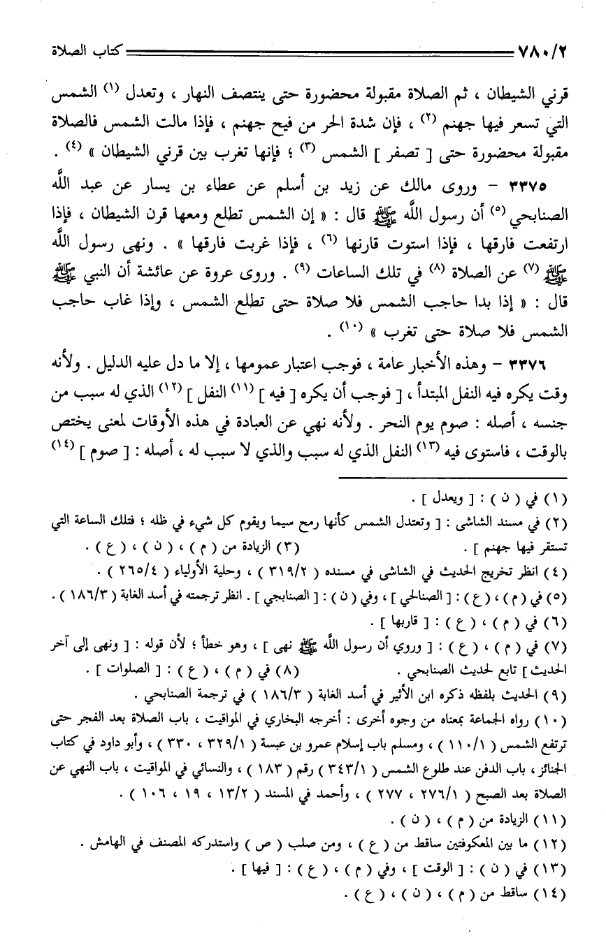 3375 - وروى مالك عن زيد بن أسلم عن عطاء بن يسار عن عبد الله الصنابحي أن رسول الله - صلى الله عليه وسلم - قال: "إن الشمس تطلع ومعها قرن الشيطان، فإذا ارتفعت فارقها، فإذا استوت قارنها، فإذا عربت فارقها".ونهى رسول الله - صلى الله عليه وسلم - عن الصلاة في تلك الساعات، وروى عروة عن عائشة أن النبي - صلى الله عليه وسلم - قال: "إذا بدا حاجب الشمس فلا صلاة حتى تطلع الشمس، وإذا غاب حاجب الشمس فلا صلاة حتى تغرب".