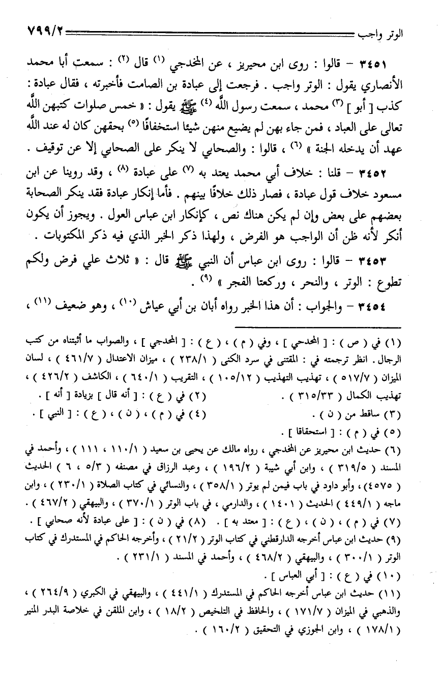 3451 - قالوا: روى ابن محيريز، عن المخدجي قال: سمعت أبا محمد الأنصاري يقول: الوتر واجب. فرجعت إلى عبادة بن الصامت فأخبرته، فقال عبادة: كذب [أبو] محمد، سمعت رسول الله - صلى الله عليه وسلم - يقول: "خمس صلوات كتبهن الله تعالى على العبادة، فمن جاء بهن لم يضيع منهن شيئا استخفافا بحقهن كان له عند الله عهد أن يدخله الجنة"، قالوا: والصحابي لا ينكر على الصحابي إلا عن توقيف.