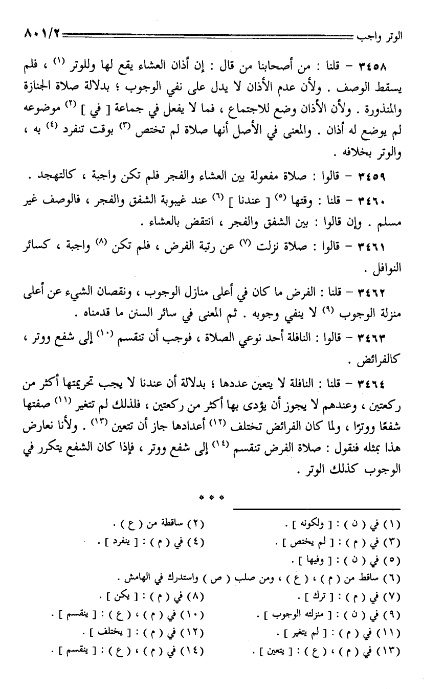 3462 - قلنا: الفرض ما كان في أعلى منازل الوجوب، ونقصان الشيء عن أعلى منزلة الوجوب لا ينفي وجوبه. ثم المعنى في سائر السنن ما قدمناه.