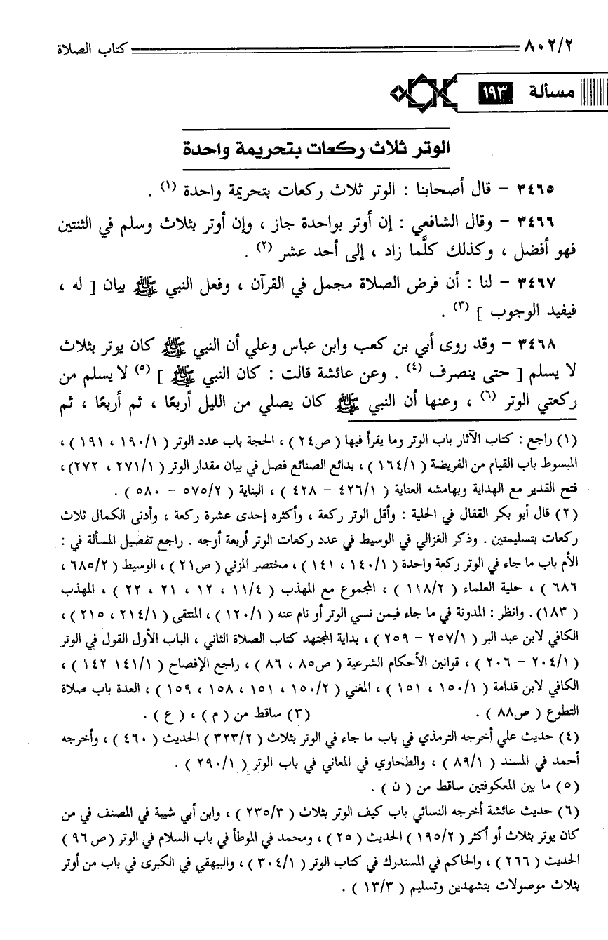 3465 - وقال أصحابنا: الوتر ثلاث ركعات بتحريمة واحدة.