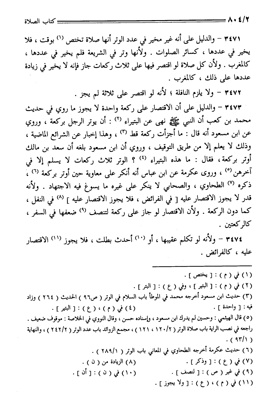 3471 - والدليل على أنه غير مخير في عدد الوتر أنها صلاة تختص بوقت، فلا يخير في عددها، كسائر الصلوات. ولأنها وتر في الشريعة لم يخير في عددها، كالمغرب. ولأن كل صلاة لو اقتصر فيها على ثلاث ركعات جاز فإنه لا يخير في زيادة عددها على ذلك، كالمغرب.