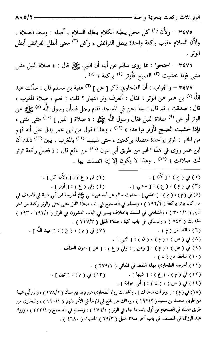 3477 - والجواب: أن الطحاوي ذكر [عن] عقبة بن مسلم قال: سألت عبد الله بن عمر عن الوتر، فقال: أتعرف وتر النهار؟ قلت: نعم، صلاة المغرب، قال: صدقت، ثم قال: بينا نحن في المسجد فقام رجل فسأل رسول الله - صلى الله عليه وسلم - عن الوتر أو عن صلاة الليل فقال رسول الله - صلى الله عليه وسلم -: "صلاة [الليل] مثنى مثنى، فإذا خشيت الصبح فأوتر بواحدة"، وهذا القول من ابن عمر يدل على أنه فهم من الخبر: الوتر بواحدة متصلة بركعتين، حتى شبهها بالمغرب. يبين ذلك ابن عمر روى في هذا الخبر من طريق أبي عون عن نافع قال: "فصل ركعة توتر لك صلاتك". وهذا لا يكون إلا إذا اتصلت بها.