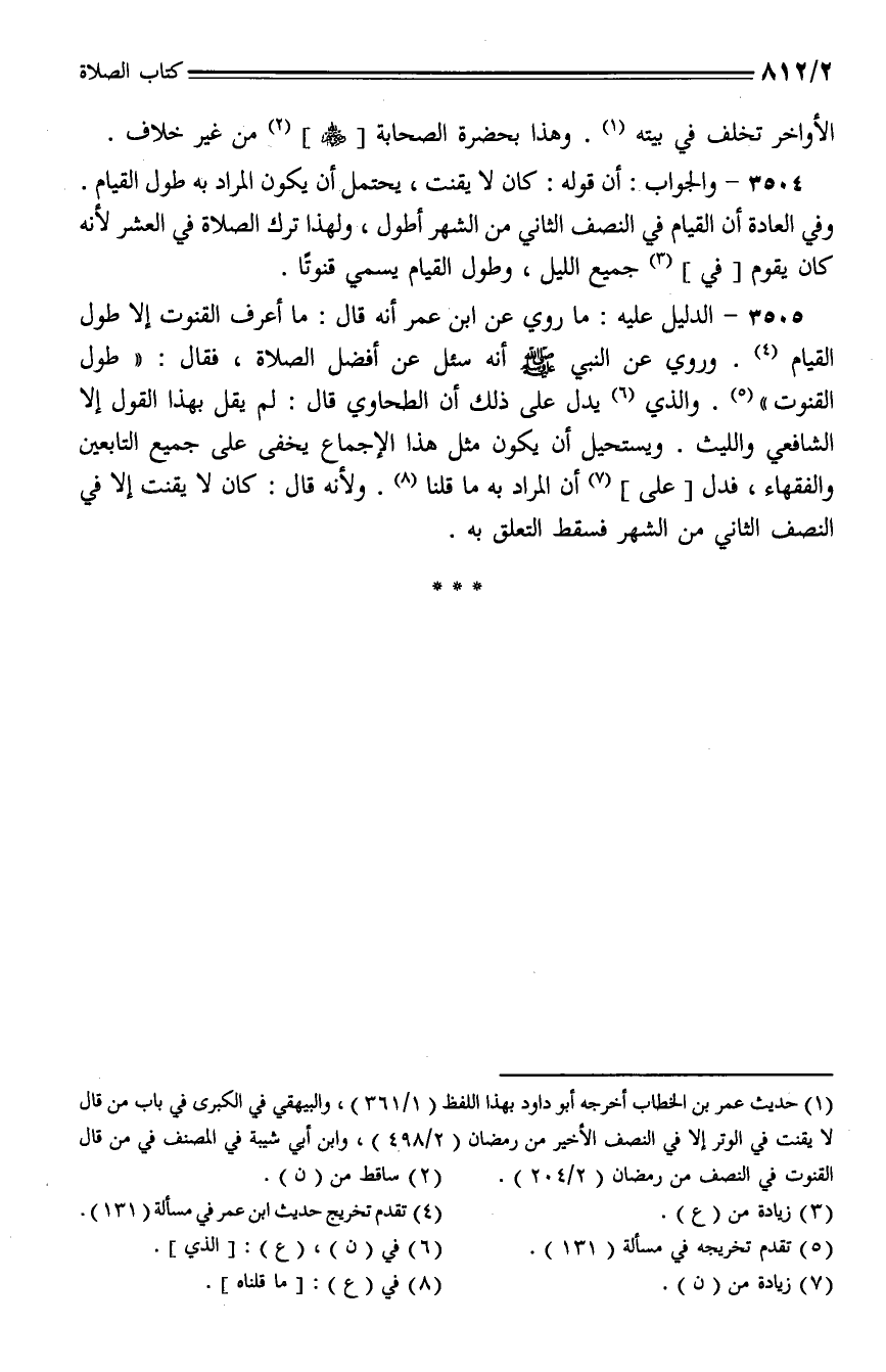 3504 - والجواب: أن قوله: كان لا يقنت، يحتمل أن يكون المراد به طول القيام. وفي العادة أن القيام في النصف الثاني من الشهر أطول، ولهذا ترك الصلاة في العشر لأنه كان يقوم [في] جميع الليل، وطول القيام يسمي قنوتا.