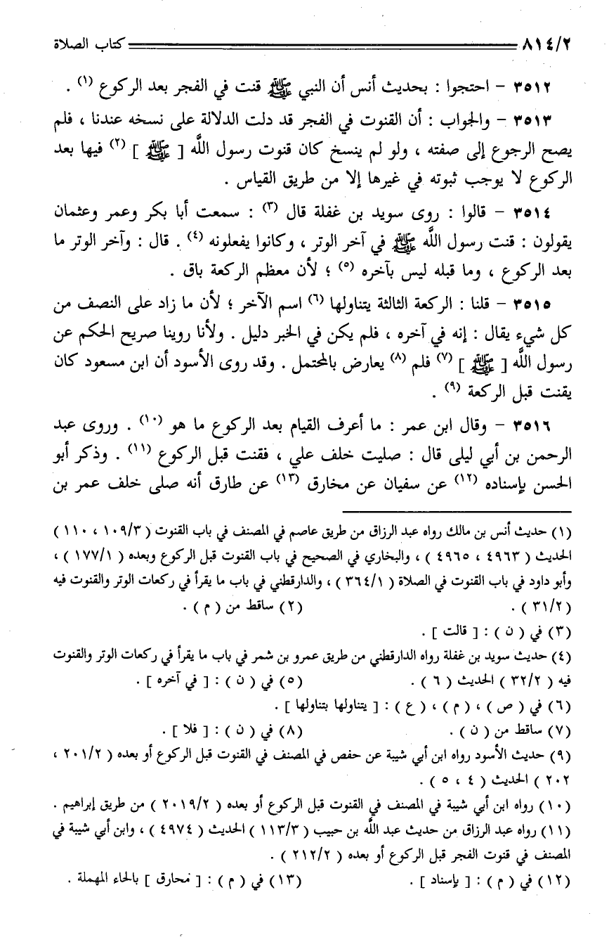 3512 - احتجوا: بحديث أنس أن النبي - صلى الله عليه وسلم - قنت في الفجر بعد الركوع.