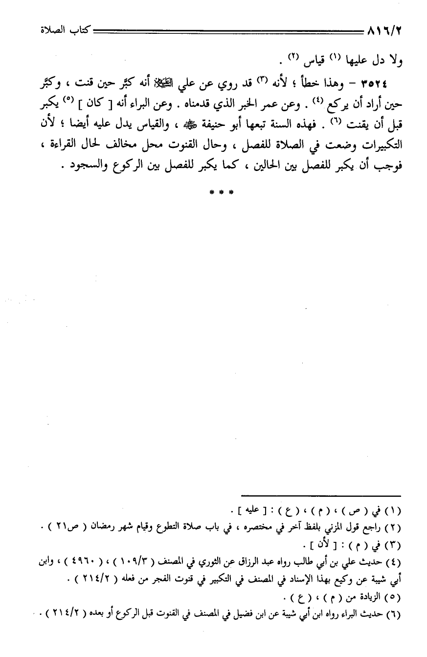 3524 - وهذا خطأ؛ لأنه قد روي عن علي - عليه السلام - أنه كبر حين قنت، وكبر حين أراد أن يركع. وعن عمر الخبر الذي قدمناه. وعن البراء أنه [كان] يكبر قبل أن يقنت. فهذه السنة تبعها أبو حنيفة - رضي الله عنه -، والقياس يدل عليه أيضا؛ لأن التكبيرات وضعت في الصلاة للفصل، وحال القنوت محل مخالف لحال القراءة، فوجب أن يكبر للفصل بين الحالين، كما يكبر للفصل بين الركوع والسجود.