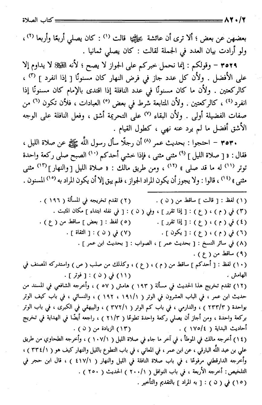 3530 - احتجوا: بحديث عمر أن رجلا سأل رسول الله - صلى الله عليه وسلم - عن صلاة الليل، فقال: " [صلاة الليل] مثنى مثنى، فإذا خشي أحدكم الصبح صلى ركعة واحدة توتر له ما قد صلى"، ومن طريق مالك: "صلاة الليل [والنهار] مثنى مثنى"، قالوا: ولا يجوز أن يكون المراد الجواز، فلم يبق إلا أن يكون المراد به المسنون.