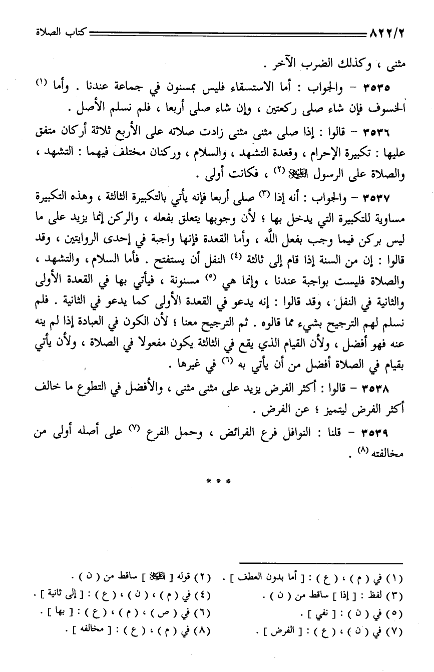 3536 - قالوا: إذا صلى مثنى مثنى زادت صلاته على الأربع ثلاثة أركان متفق عليها: تكبيرة الإحرام، وقعدة التشهد، والسلام، وركنان مختلف فيهما: التشهد، والصلاة على الرسول - عليه السلام - فكانت أولى.