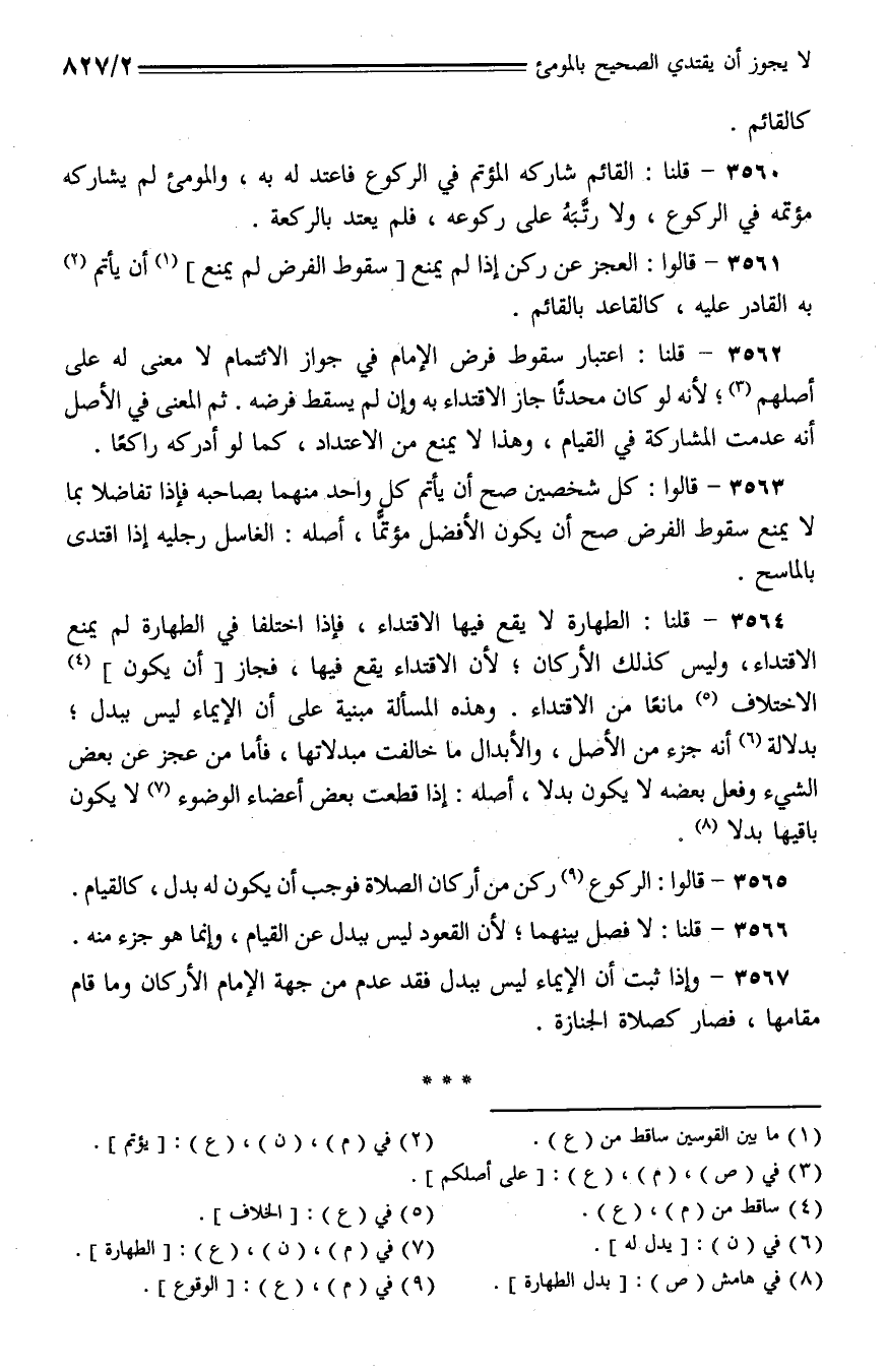 3560 - قلنا: القائم شاركه المؤتم في الركوع فاعتد له به، والمومئ لم يشاركه مؤتمه في الركوع، ولا رتبه على ركوعه، فلم يعتد بالركعة.