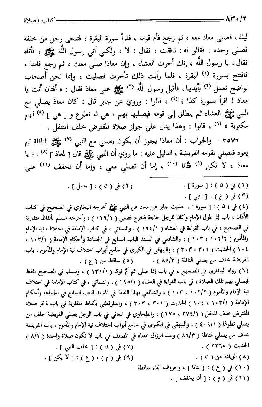 3576 - والجواب: أن معاذا يجوز أن يكون يصلي مع النبي - صلى الله عليه وسلم - النافلة ثم يعود فيصلي بقومه الفريضة، الدليل عليه: ما روي أن النبي - صلى الله عليه وسلم - قال [لمعاذ]: "يا معاذ، لا تكن فتانا، إما أن تصلي معي، وإما أن تخفف على