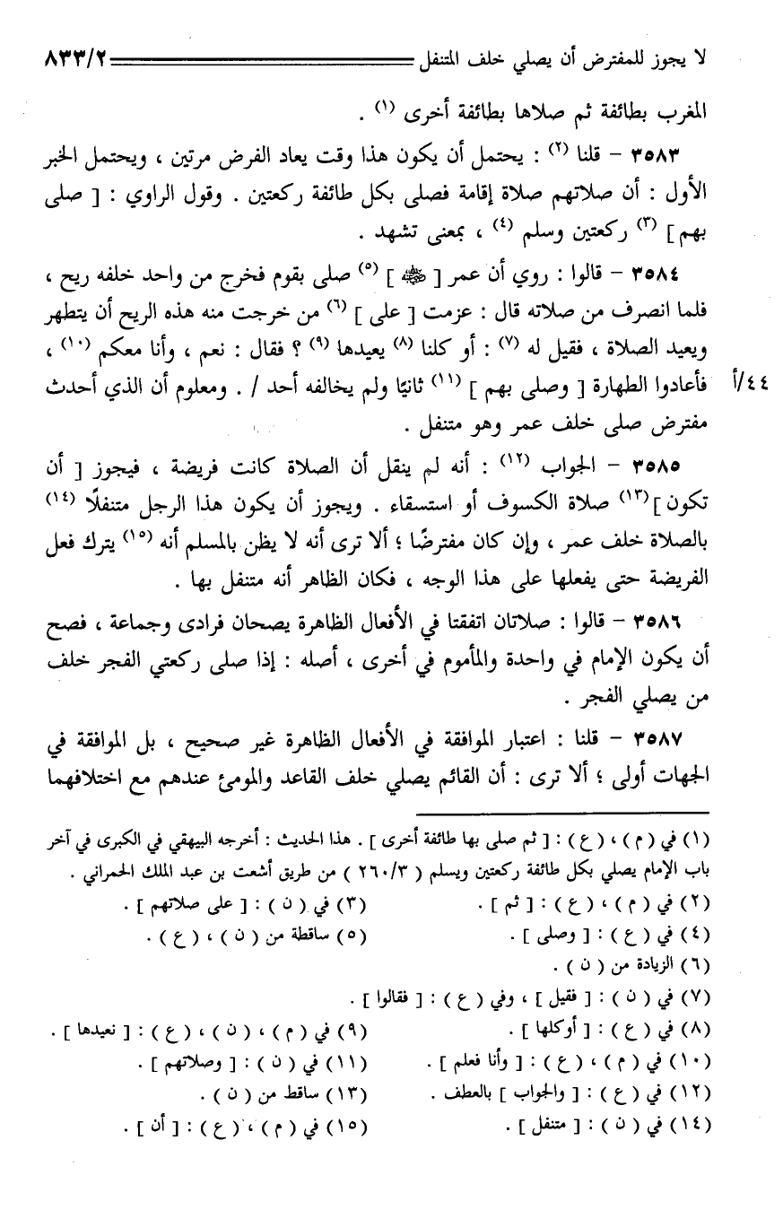 3585 - الجواب: أنه لم ينفل أن الصلاة كانت فريضة، فيجوز [أن تكون] صلاة الكسوف أو استسقاء. ويجوز أن يكون هذا الرجل متنفلا بالصلاة خلف عمر، وإن كان مفترضا؛ ألا ترى أنه لا يظن بالمسلم أنه يترك فعل الفريضة حتى يفعلها على هذا الوجه، فكان الظاهر أنه متنفل بها.