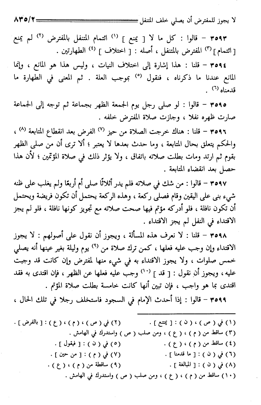 3593 - قالوا: كل ما لا [يمنع] ائتمام المتنفل بالمفترض لم يمنع [ائتمام] المفترض بالمتنفل، أصله: [اختلاف] الطهارتين.