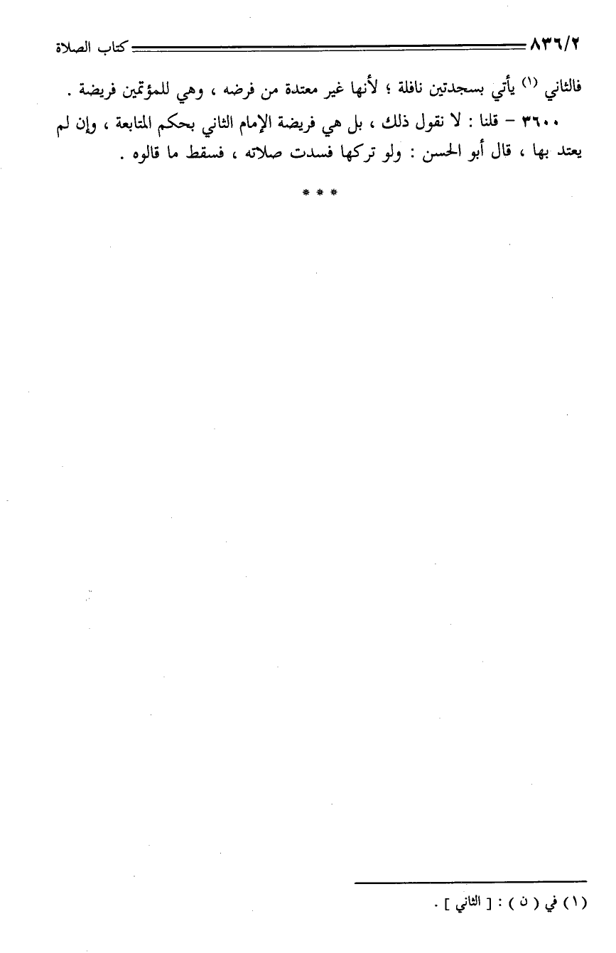 3600 - قلنا: لا نقول ذلك، بل هي فريضة الأمام الثاني بحكم المتابعة، وإن لم يعتد بها، قال أبو الحسن: ولو تركها فسدت صلاته، فسقط ما قالوه.