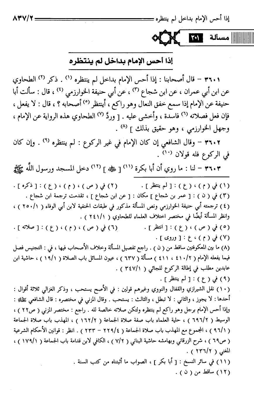 3601 - قال أصحابنا: إذا أحس الإمام بداخل لم ينتظره. ذكر الطحاوي عن ابن أبي عمران، عن ابن شجاع، عن أبي حنيفة الخوارزمي، قال: سألت أبا حنيفة عن الإمام إذا سمع خفق النعال وهو راجع، أينتظر أصحابه؟، قال: لا يفعل، فإن فعل فصلاته فاسدة، وأخشى عليه. [ورد الطحاوي هذه الرواية عن الإمام، وجهل الخوارزمي، وهو حقيق بذلك].
