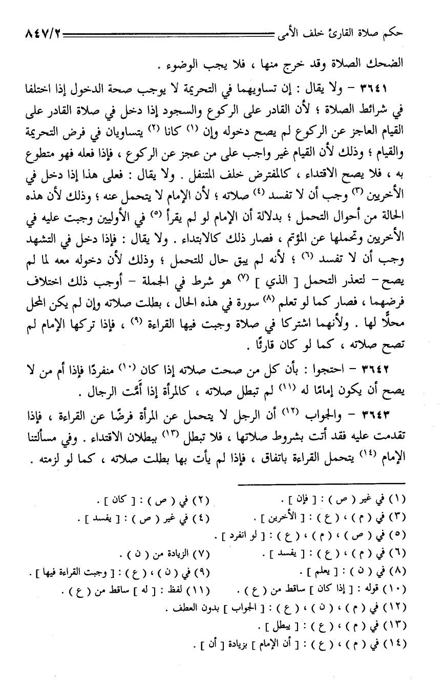 3641 - ولا يقال: إن تساويهما في التحريمة لا يوجب صحة الدخول إذا اختلفا في شرائط الصلاة؛ لأن القادر على الركوع والسجود إذا دخل في صلاة القادر على القيام العاجز عن الركوع لم يصح دخوله وإن كانا يتساويان في فرض التحريمة والقيام؛ وذلك لأن القيام غير واجب على من عجز عن الركوع، فإذا فعله فهو متطوع به، فلا يصح الاقتداء، كالمفترض خلف المتنفل. ولا يقال: فعلى هذا إذا دخل في الآخرين وجب أن لا تفسد صلاته؛ لأن الإمام لا يتحمل عنه؛ وذلك لأن هذه الحالة من أحوال التحمل؛ بدلالة أن الإمام لو لم يقرأ في الأوليين وجبت عليه في الآخرين وتحملها عن المؤتم، فصار ذلك كالابتداء. ولا يقال: فإذا دخل في التشهد وجب أن لا تفسد؛ لأنه لم يبق حال للتحمل؛ وذلك لأن دخوله معه لما لم يصح- لتعذر التحمل [الذي] هو شرط في الجملة- أوجب ذلك اختلاف فرضهما، فصار كما لو تعلم سورة في هذه الحال، بطلت صلاته وإن لم يكن المحل محلا لها. ولأنهما اشتركا في صلاة وجبت فيها القراءة، فإذا تركها الإمام لم تصح صلاته، كما لو كان قارئا.