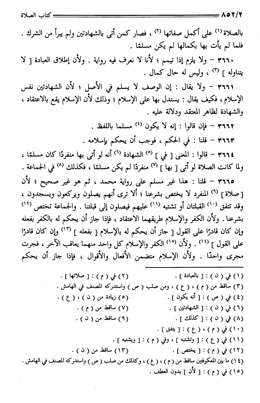 3664 - قالوا: المعنى [في] الشهادة أنه لو أتى بها منفردا كان مسلما، ولما كانت الصلاة لو أتى [بها] منفردا لم يكن مسلما، فكذلك في الجماعة.
