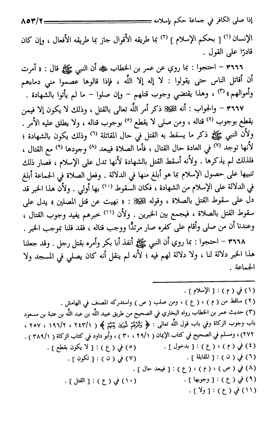 3666 - احجتوا: بما روي عن عمر بن الخطاب - رضي الله عنه - قال: "أمرت أن أقاتل الناس حتى يقولوا: لا إله إلا الله، فإذا قالوها عصموا مني دماءهم وأموالهم"، وهذا يقتضي وجوب قتلهم- وإن صلوا- ما لم يأتوا بالشهادة.