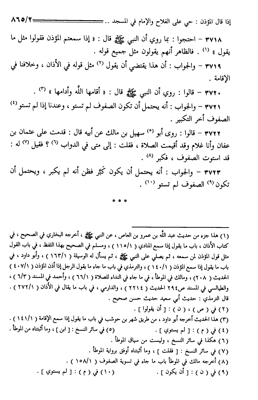 3718 - احتجوا: بما روي أن النبي - صلى الله عليه وسلم - قال: "إذا سمعتم المؤذن فقولوا مثل ما يقول". فالظاهر أنهم يقولون مثل جميع قوله.
