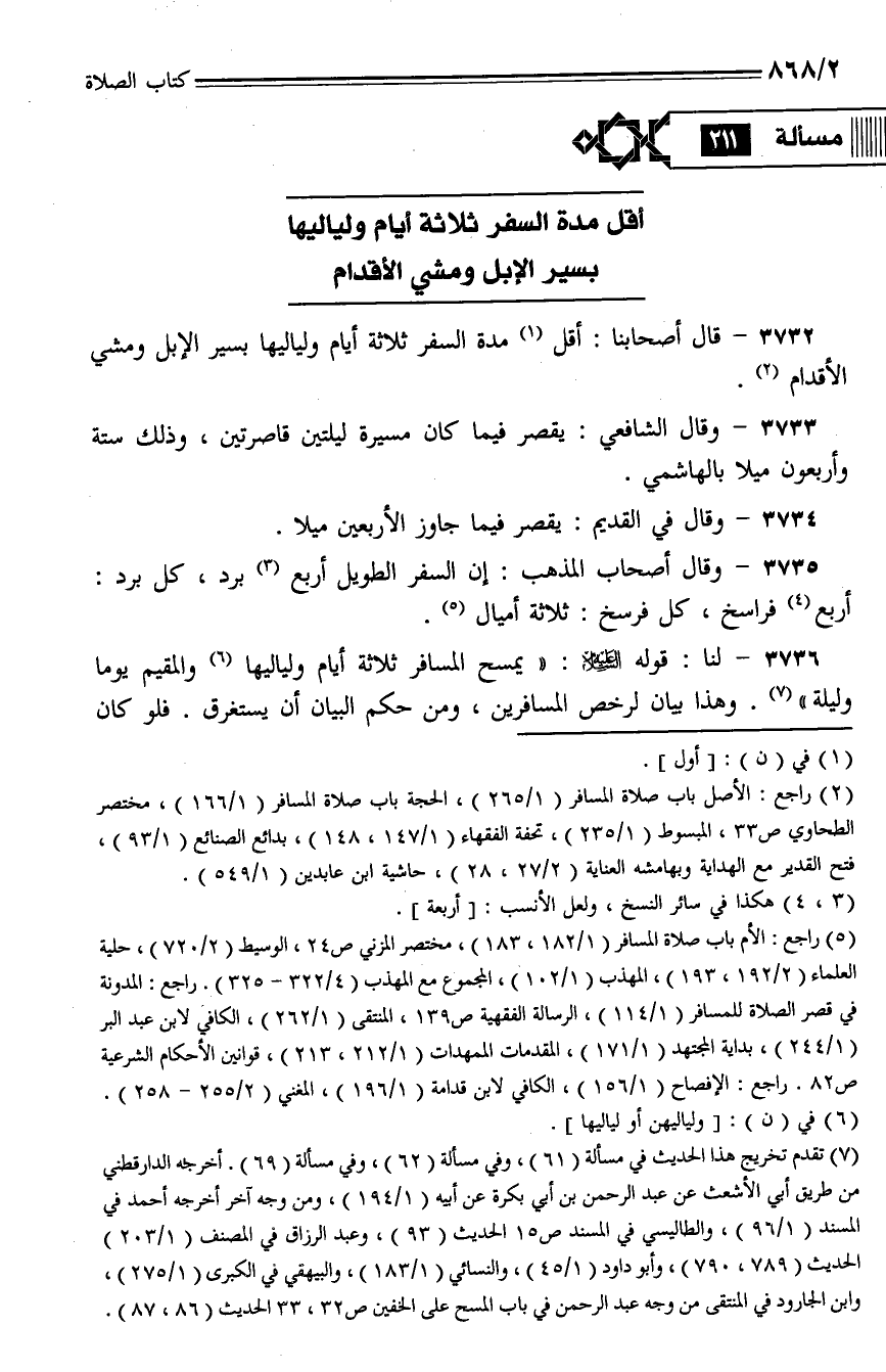 3732 - قال أصحابنا: أقل مدة السفر ثلاثة أيام ولياليها بسير الإبل ومشي الأقدام.