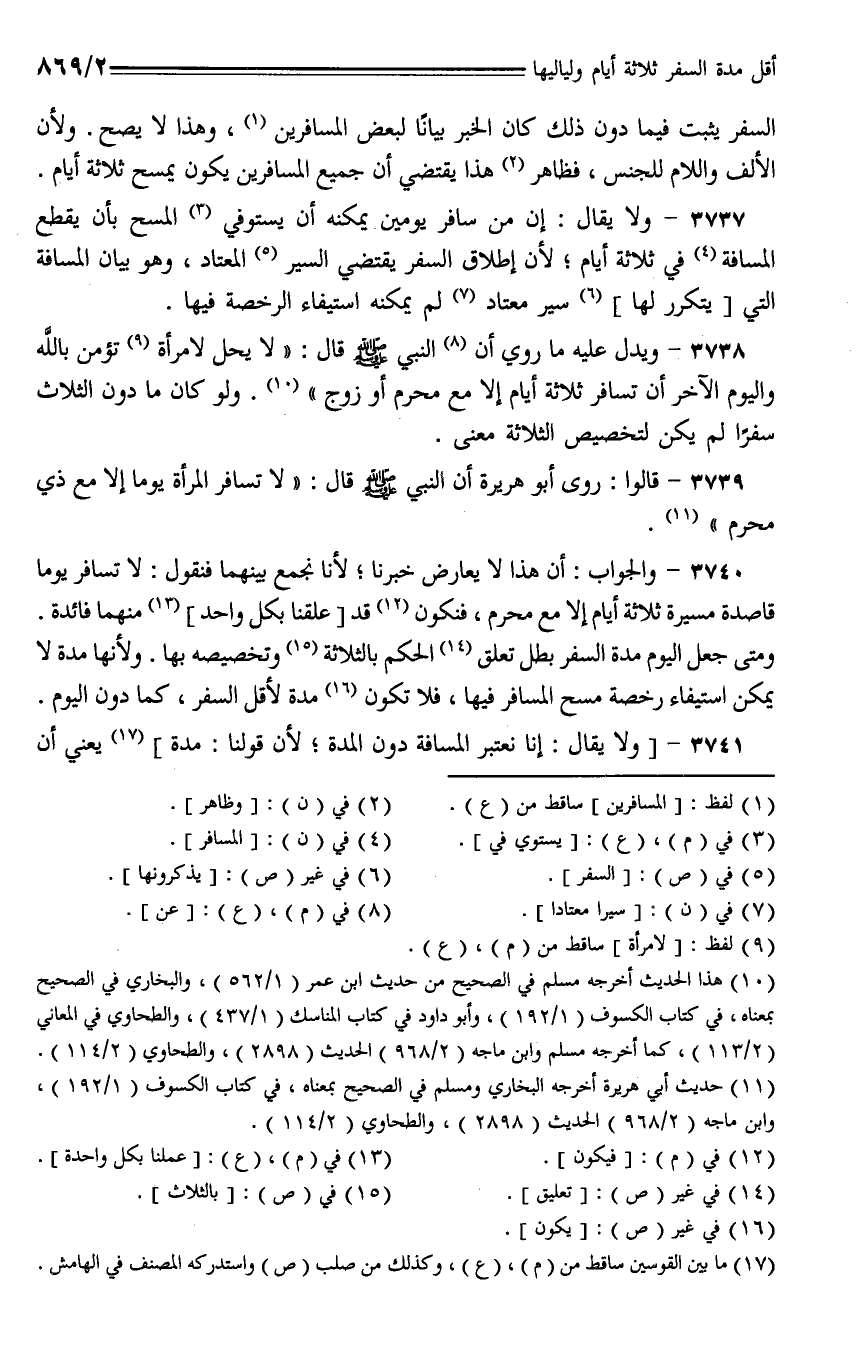 3738 - ويدل عليه ما روي أن النبي - صلى الله عليه وسلم - قال: (لا يحل لامرأة تؤمن بالله واليوم الآخر أن تسافر ثلاثة أيام إلا مع محرم أو زوج). ولو كان ما دون الثلاث سفرا لم يكن لتخصيص الثلاثة معنى.