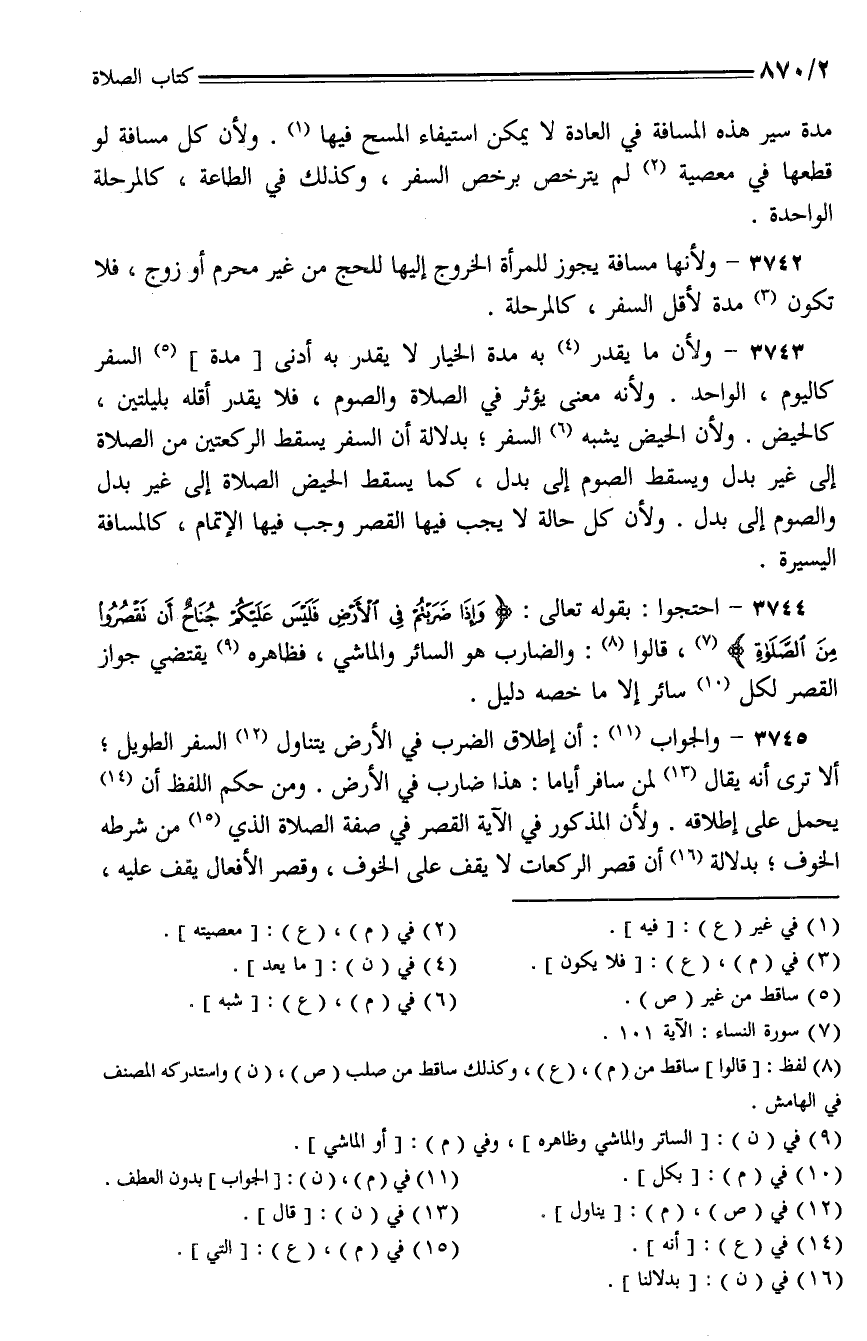 3743 - ولأن ما يقدر به مدة الخيار لا يقدر به أدنى [مدة] السفر كاليوم، الواحد. ولأنه معنى يؤثر في الصلاة والصوم، فلا يقدر أقله بليلتين، كالحيض. ولأن الحيض يشبه السفر؛ بدلالة أن السفر يسقط الركعتين من الصلاة إلى غير بدل ويسقط الصوم إلى بدل، كما يسقط الحيض الصلاة إلى غير بدل والصوم إلى يدل. ولأن كل حالة لا يجب فيها القصر وجب فيها الإتمام، كالمسافة اليسيرة.