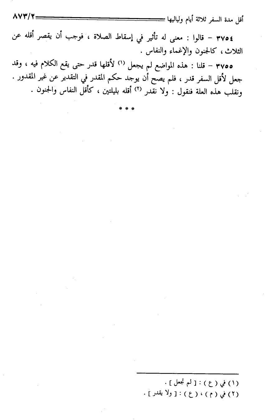 3755 - قلنا: هذه المواضع لم يجعل لأقلها قدر حتى يقع الكلام فيه، وقد جعل لأقل السفر قدر، فلم يصح أن يوجد حكم المقدر في التقدير عن غير المقدور. ونقلب هذه العلة فنقول: ولا نقدر أقله بليلتين، كأقل النفاس والجنون.