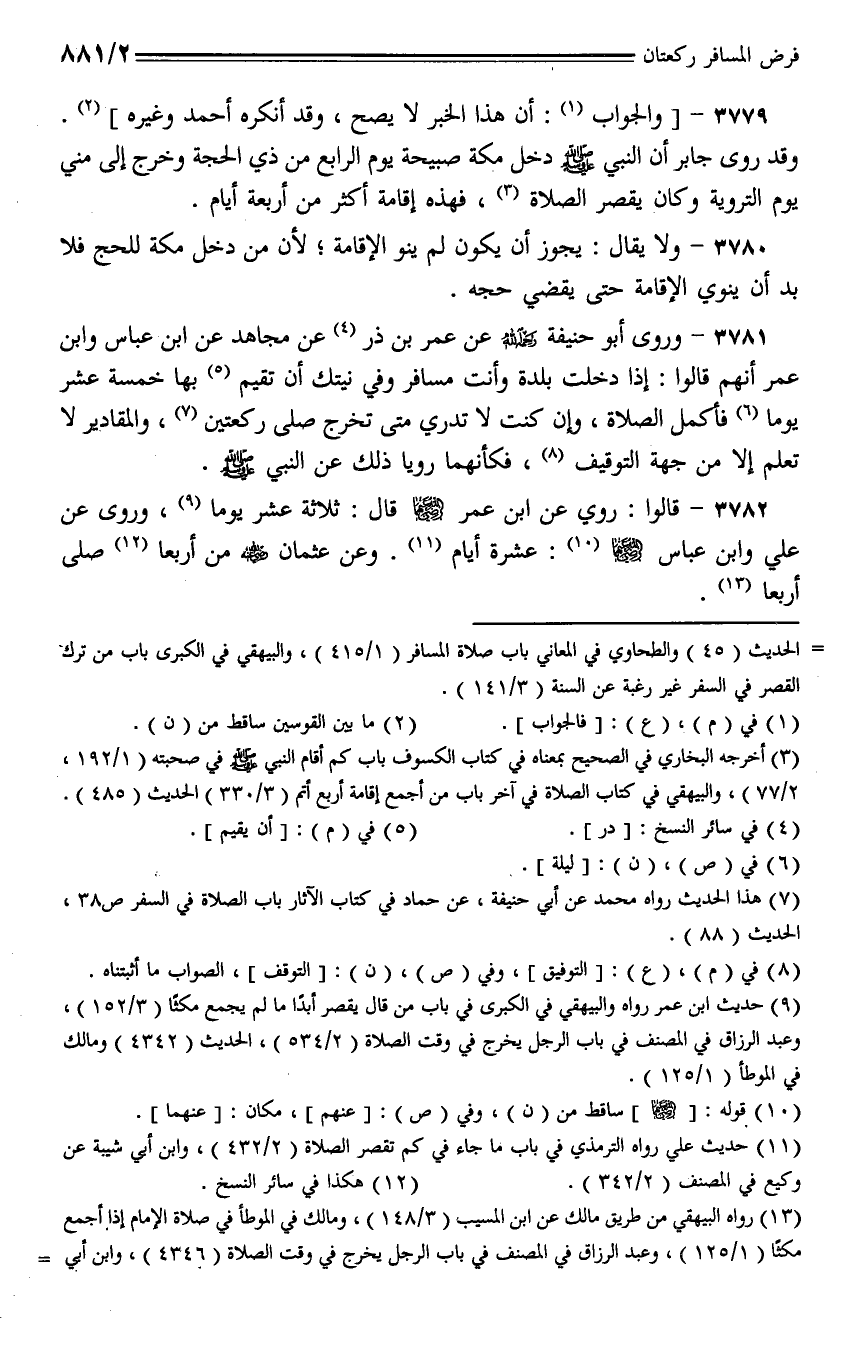 3781 - وروى أبو حنيفة عن عمر بن ذر عن مجاهد عن ابن عباس وابن عمر أنهم قالوا: إذا دخلت بلدة وأنت مسافر وفي نيتك أن تقيم بها خمسة عشر يوما فأكمل الصلاة، وإن كنت لا تدري متى تخرج صلى ركعتين، والمقادير لا تعلم إلا من جهة التوقيف، فكأنهما رويا ذلك عن النبي - صلى الله عليه وسلم -.