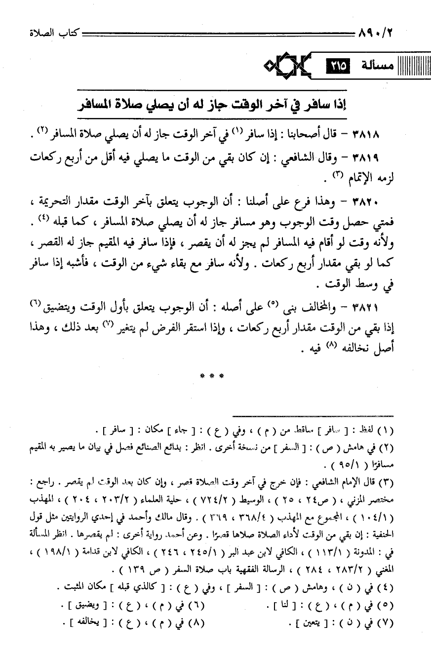 3818 - قال أصحابنا: إذا سافر في آخر الوقت جاز له أن يصلي صلاة المسافر.
