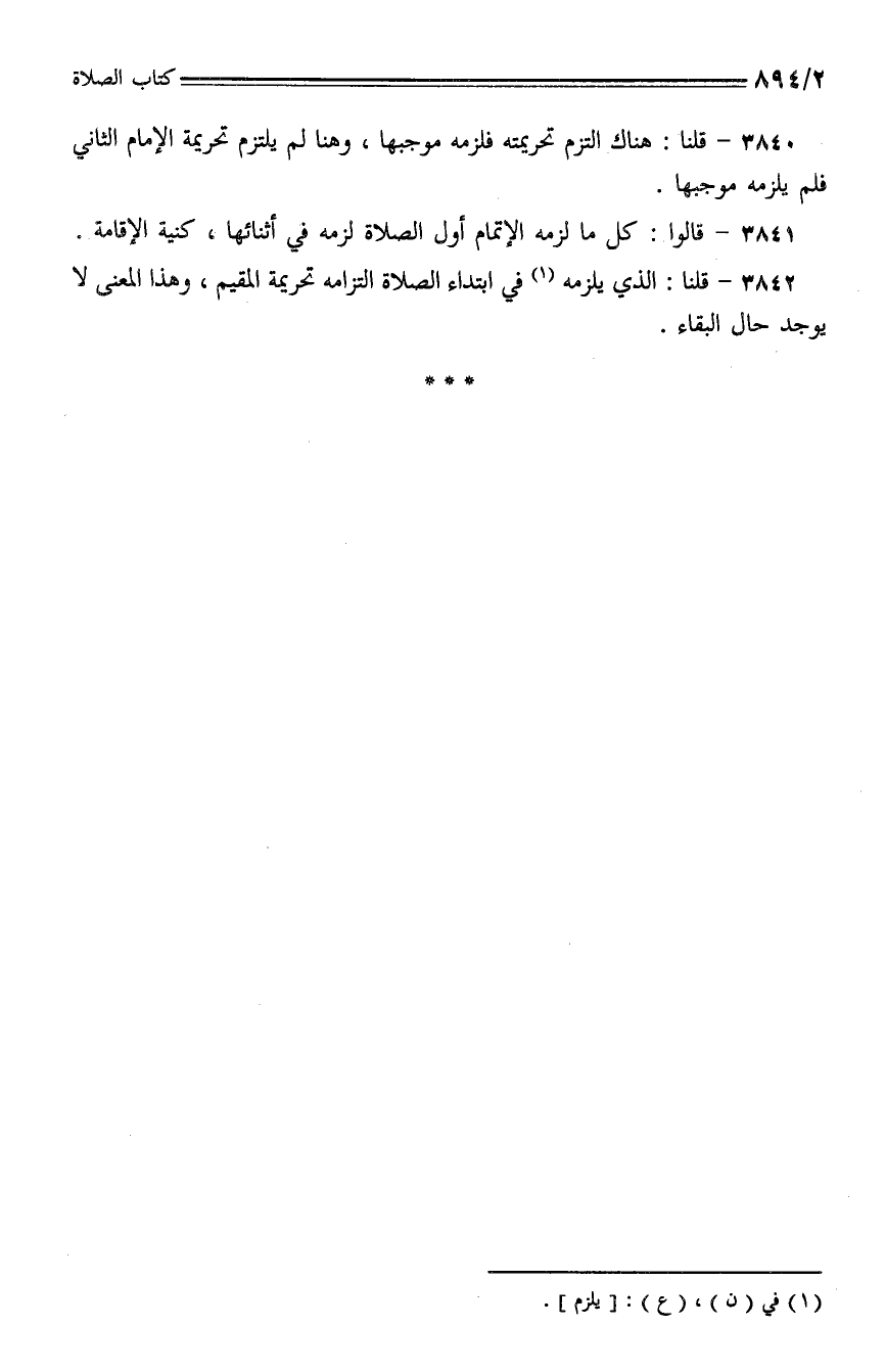 3841 - قالوا: كل ما لزمه الإتمام أول الصلاة لزمه في أثنائها، كنية الإقامة.