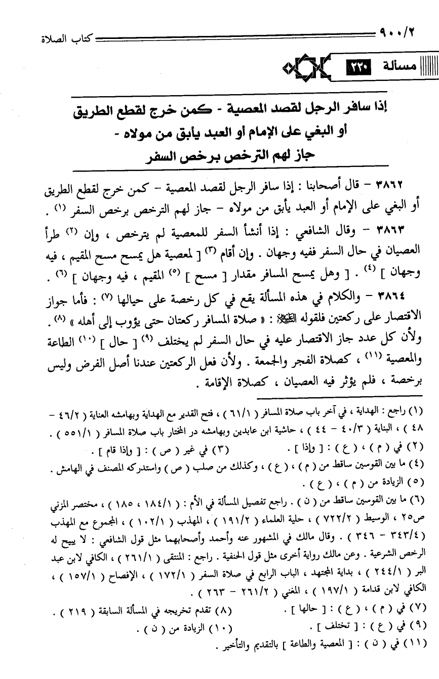 3863 - وقال الشافعي: إذا أنشأ السفر للمعصية لم يترخص، وإن طرأ العصيان في حال السفر ففيه وجهان. وإن أقام [لمعصية هل يمسح مسح المقيم، فيه وجهان]. [وهل يمسح المسافر مقدار [مسح] المقيم، فيه وجهان].