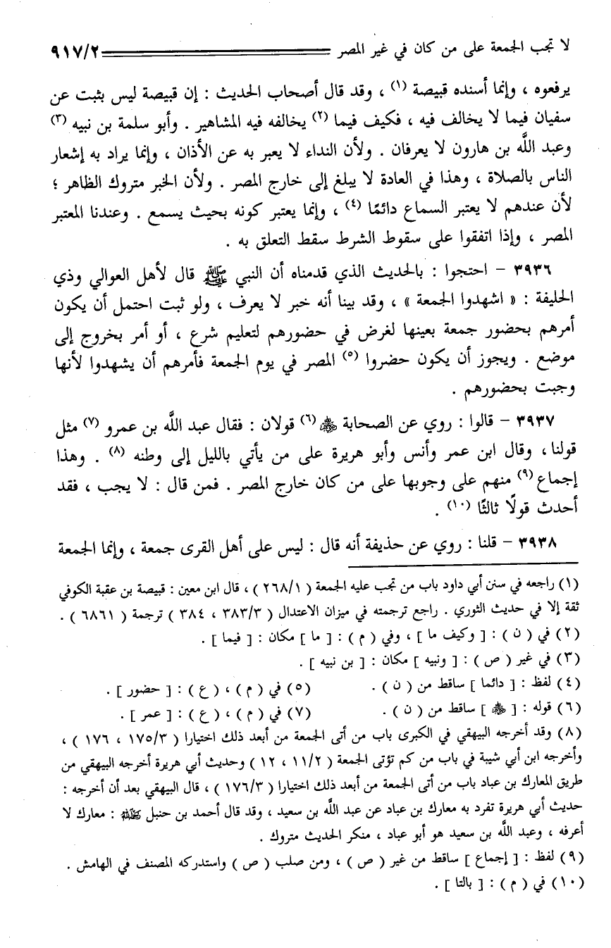 3938 - قلنا: روي عن حذيفة أنه قال: ليس على أهل القرى جمعة، وإنما الجمعة