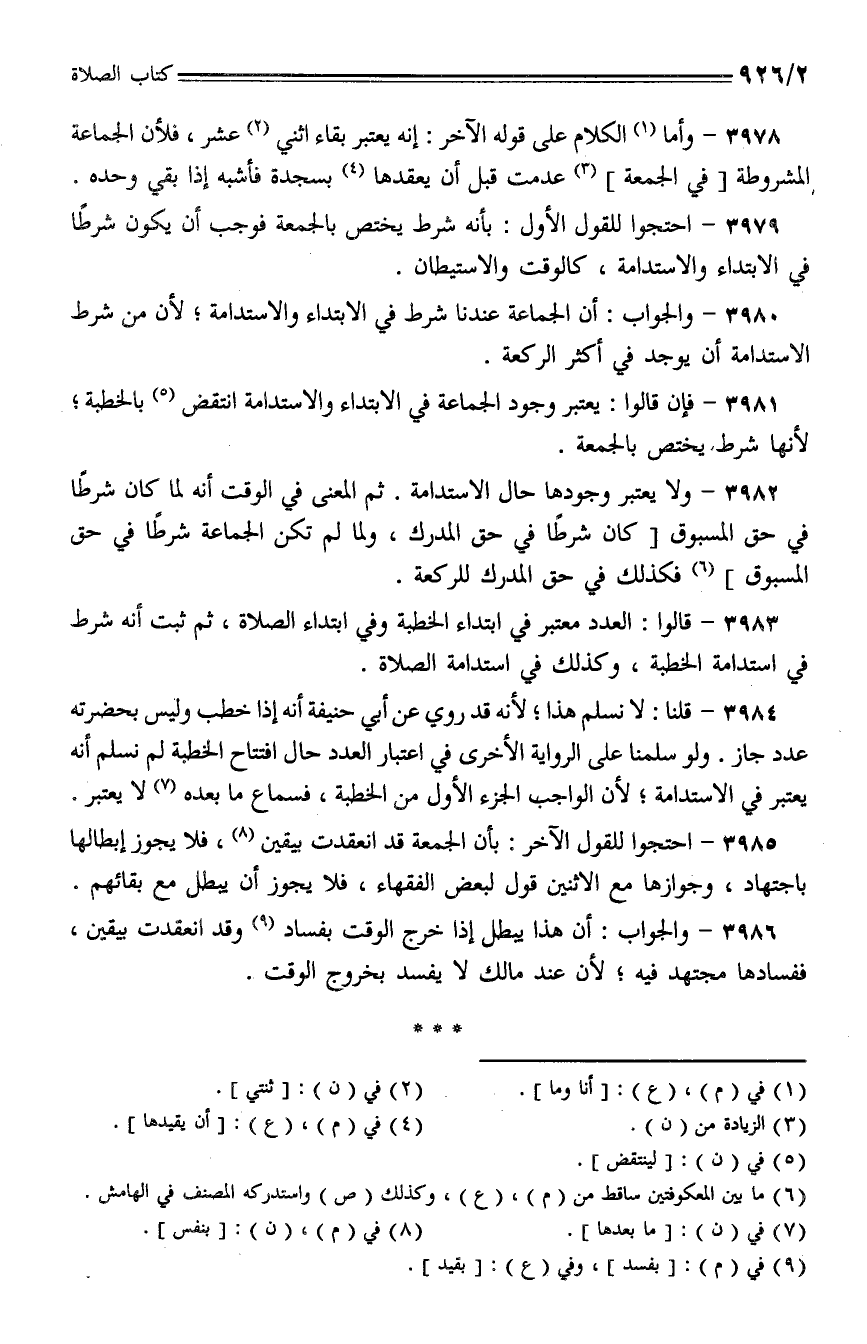 3983 - قالوا: العدد معتبر في ابتداء الخطبة وفي ابتداء الصلاة، ثم ثبت أنه شرط في استدامة الخطبة، وكذلك في استدامة الصلاة.