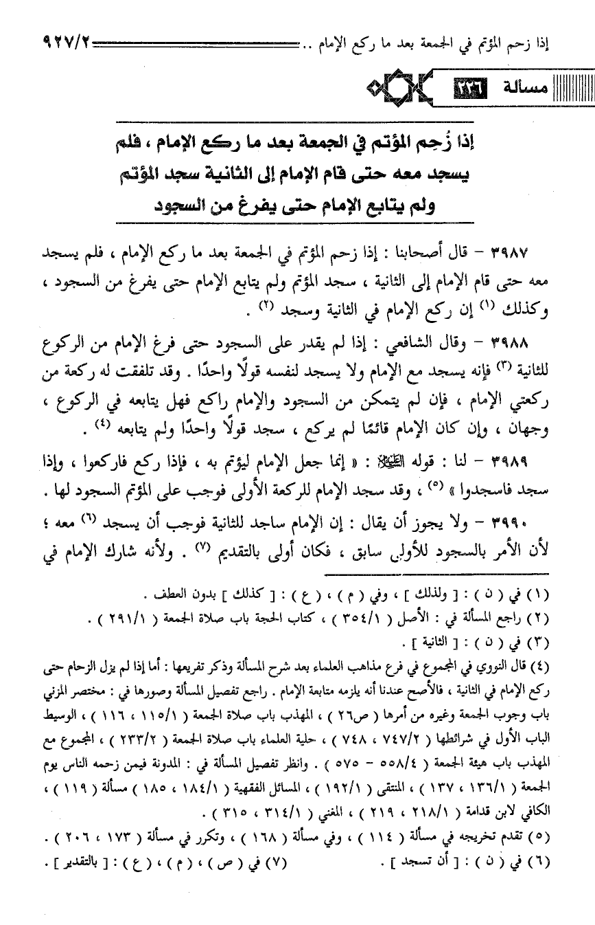 3990 - ولا يجوز أن يقال: إن الإمام ساجد للثانية فوجب أن يسجد معه؛ لأن الأمر بالسجود للأولى سابق، فكان أولى بالتقديم. ولأنه شارك الإمام في