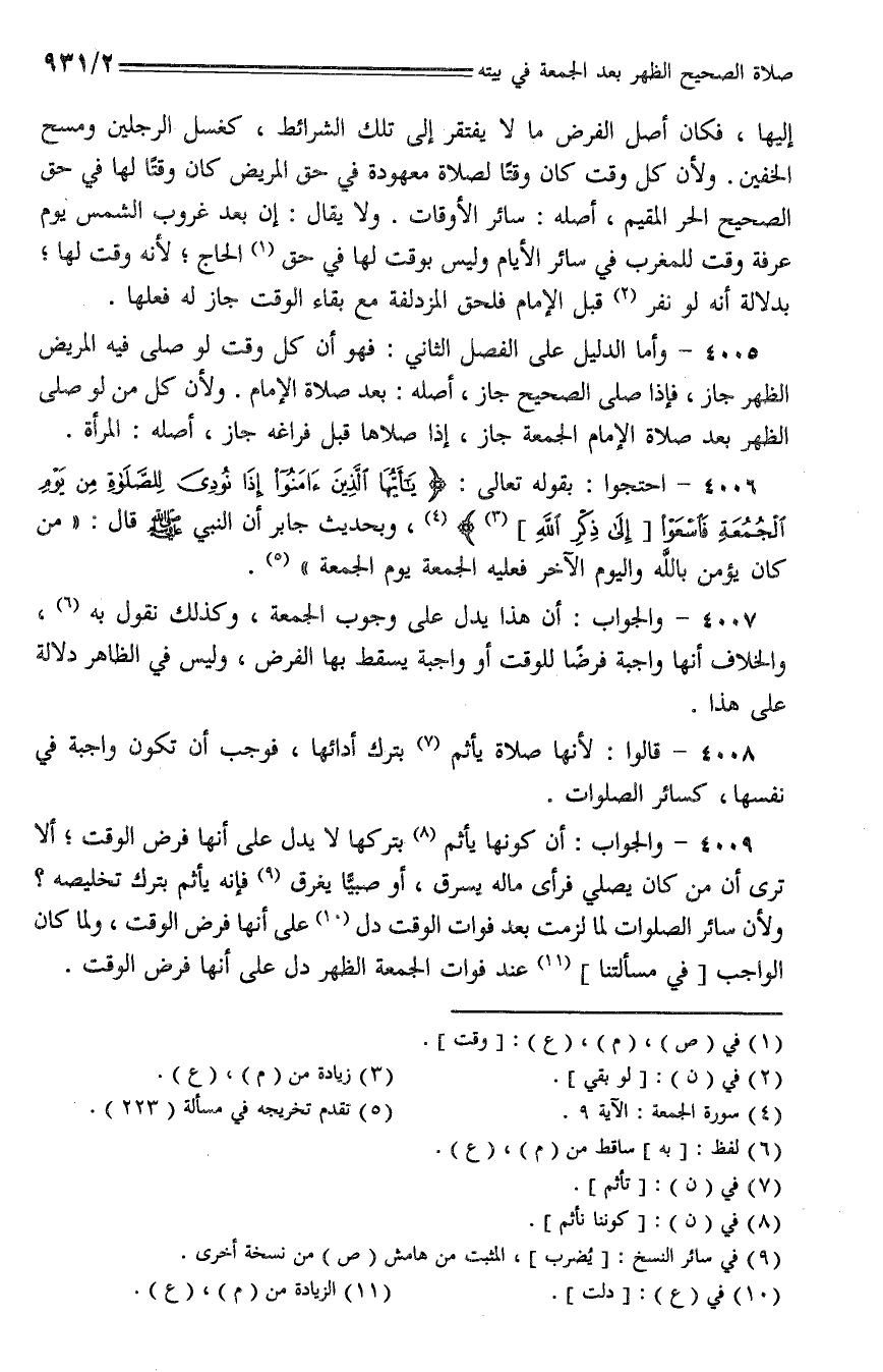 4007 - والجواب: أن هذا يدل على وجوب الجمعة، وكذلك نقول به، والخلاف أنها واجبة فرضا للوقت أو واجبة يسقط بها الفرض، وليس في الظاهر دلالة على هذا.