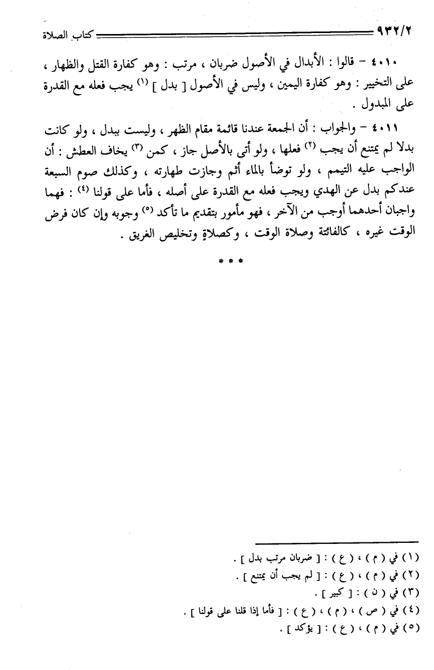 4010 - قالوا: الأبدال في الأصول ضربان، مرتب: وهو كفارة القتل والظهار، على التخيير: وهو كفارة اليمين، وليس في الأصول [بدل] يجب فعله مع القدرة على المبدول.