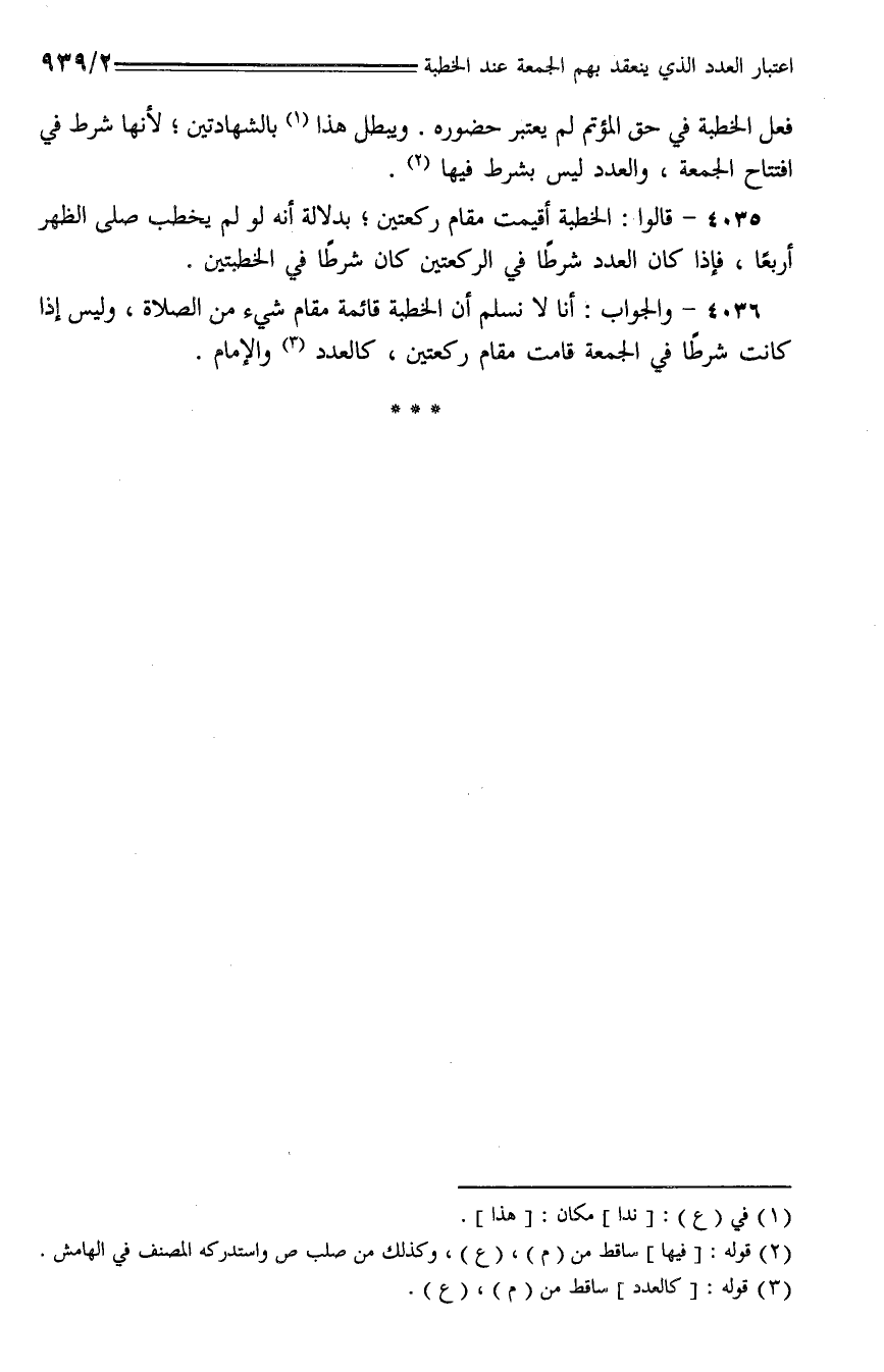 4036 - والجواب: أنا لا نسلم أن الخطبة قائمة مقام شيء من الصلاة، وليس إذا كانت شرطا في الجمعة قامت مقام ركعتين، كالعدد والإمام.
