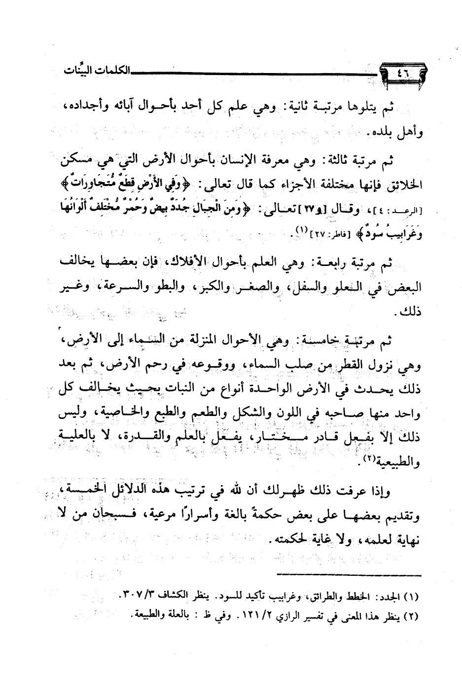 ثم مرتبة خامسة: وهي الأحوال المنزلة من السماء إلى الأرض، وهي نزول القطر من صلب السماء، ووقوعه في رحم الأرض، ثم بعد ذلك يحدث في الأرض الواحدة أنواع من النبات بحيث يخالف كل واحد منها صاحبه في اللون والشكل والطعم والطبع والخاصية، وليس ذلك إلا بفعل قادر مختار، يفعل بالعلم والقدرة، لا بالعلية والطبيعية.