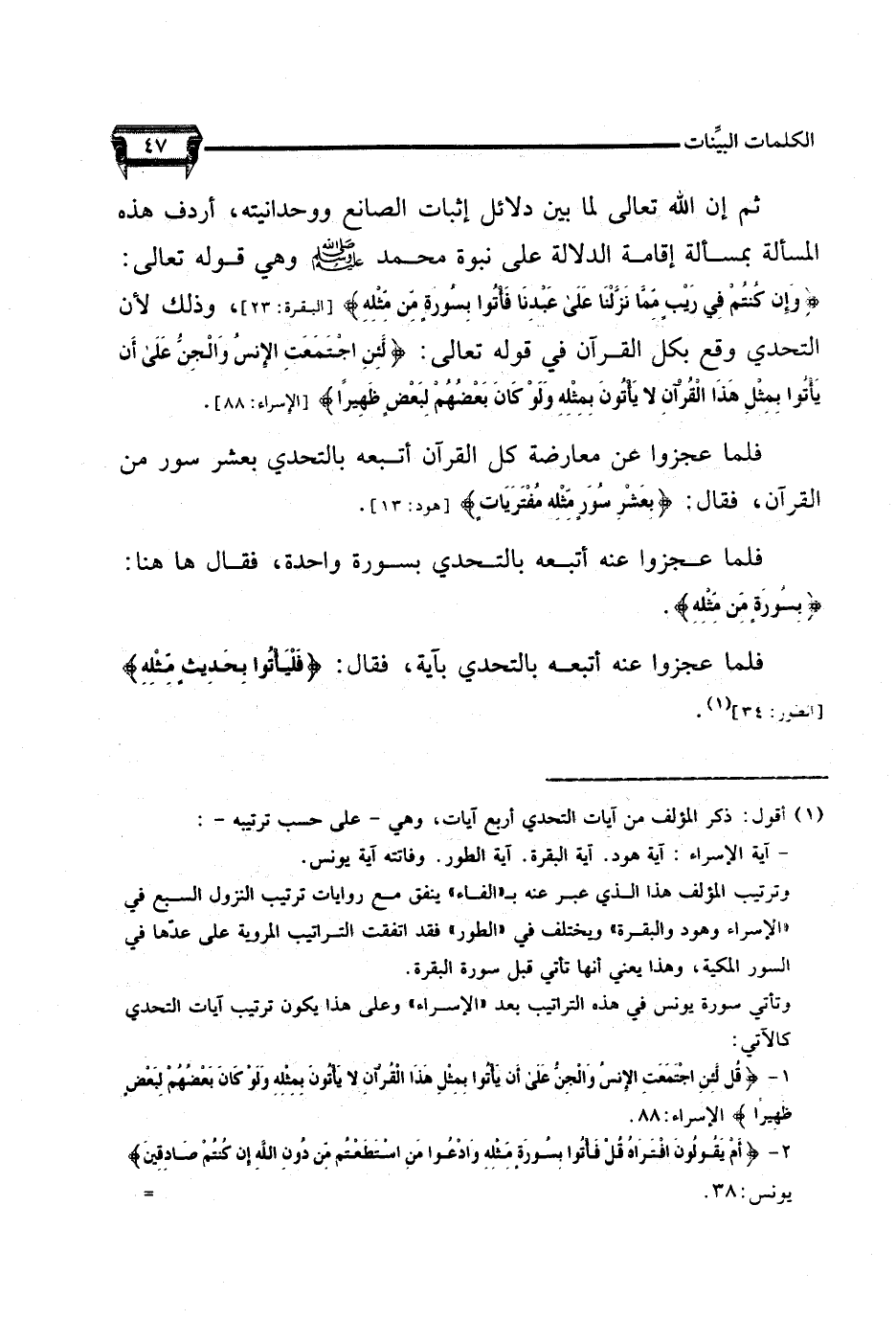 الدلالة على نبوة محمد صلى الله عليه وسلم وهي قوله تعالى: {وَإِن كُنتُمْ فِي رَيْبٍ مِّمَّا نَزَّلْنَا عَلَى عَبْدِنَا فَأْتُواْ بِسُورَةٍ مِّن مِّثْلِهِ}، وذلك لأن التحدي وقع بكل القرآن في قوله تعالى: {لَّئِنِ اجْتَمَعَتِ الإِنسُ وَالْجِنُّ عَلَى أَن يَأْتُواْ بِمِثْلِ هَذَا الْقُرْآنِ لاَ يَأْتُونَ بِمِثْلِهِ وَلَوْ كَانَ بَعْضُهُمْ لِبَعْضٍ ظَهِيراً}.
