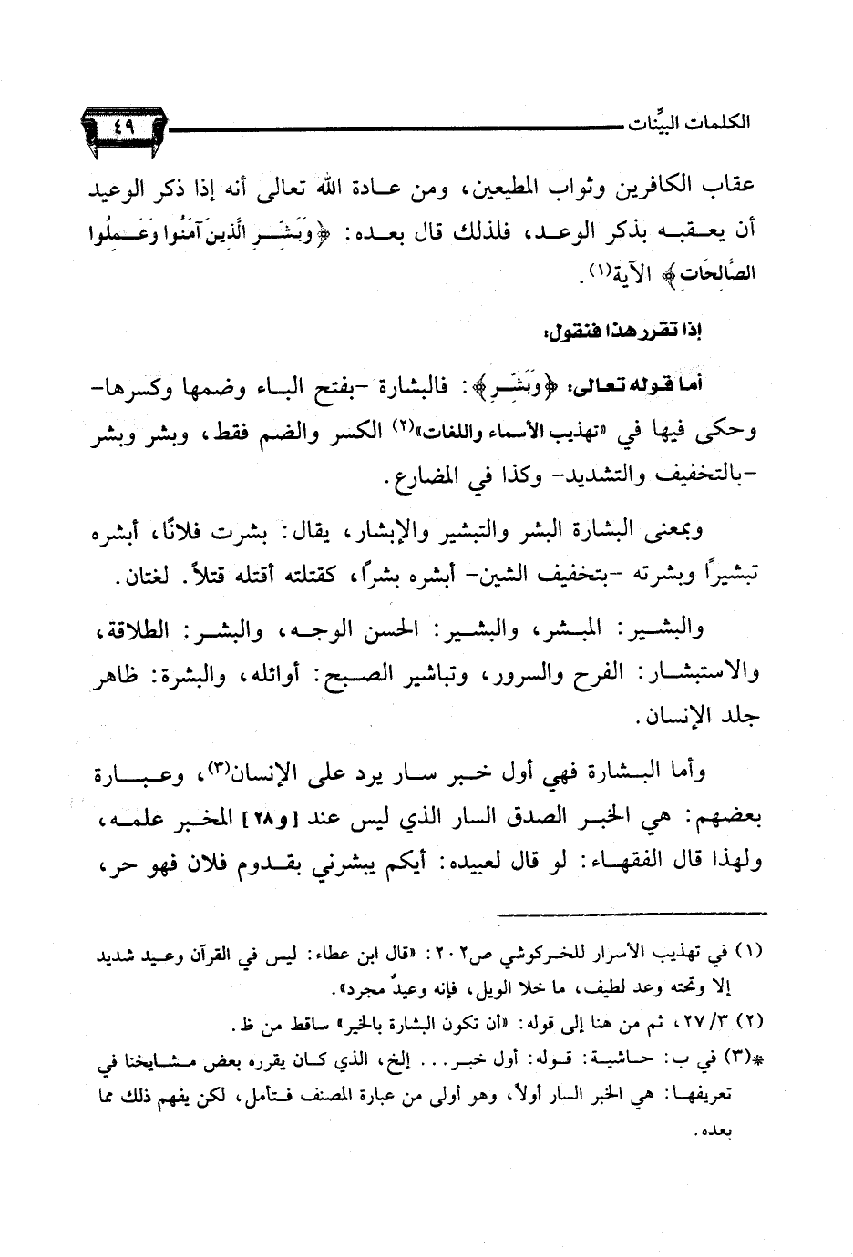 - أما قوله تعالى {وَبَشِّرِ}: فالبشارة - بفتح الباء وضمها وكسرها -. وحكى فيها في تهذيب الأسماء واللغات الكسر والضم فقط، وبَشَر وبشّر - بالتخفيف والتشديد - وكذا في المضارع. وبمعنى البشارة والبشر والتبشير والإبشار، يقال: بشّرت فلاناً، أبشره تبشيراً وبشرته - بتخفيف الشين - أبشره بشراً، كقتلته أقلته قتلاً. لغتان. والبشير: المبشر، والبشير: الحسن الوجه، والبشر: الطلاقة، والاستبشار: الفرح والسرور، وتباشير الصبح: أوائله، والبشرة: ظاهر جلد الإنسان.