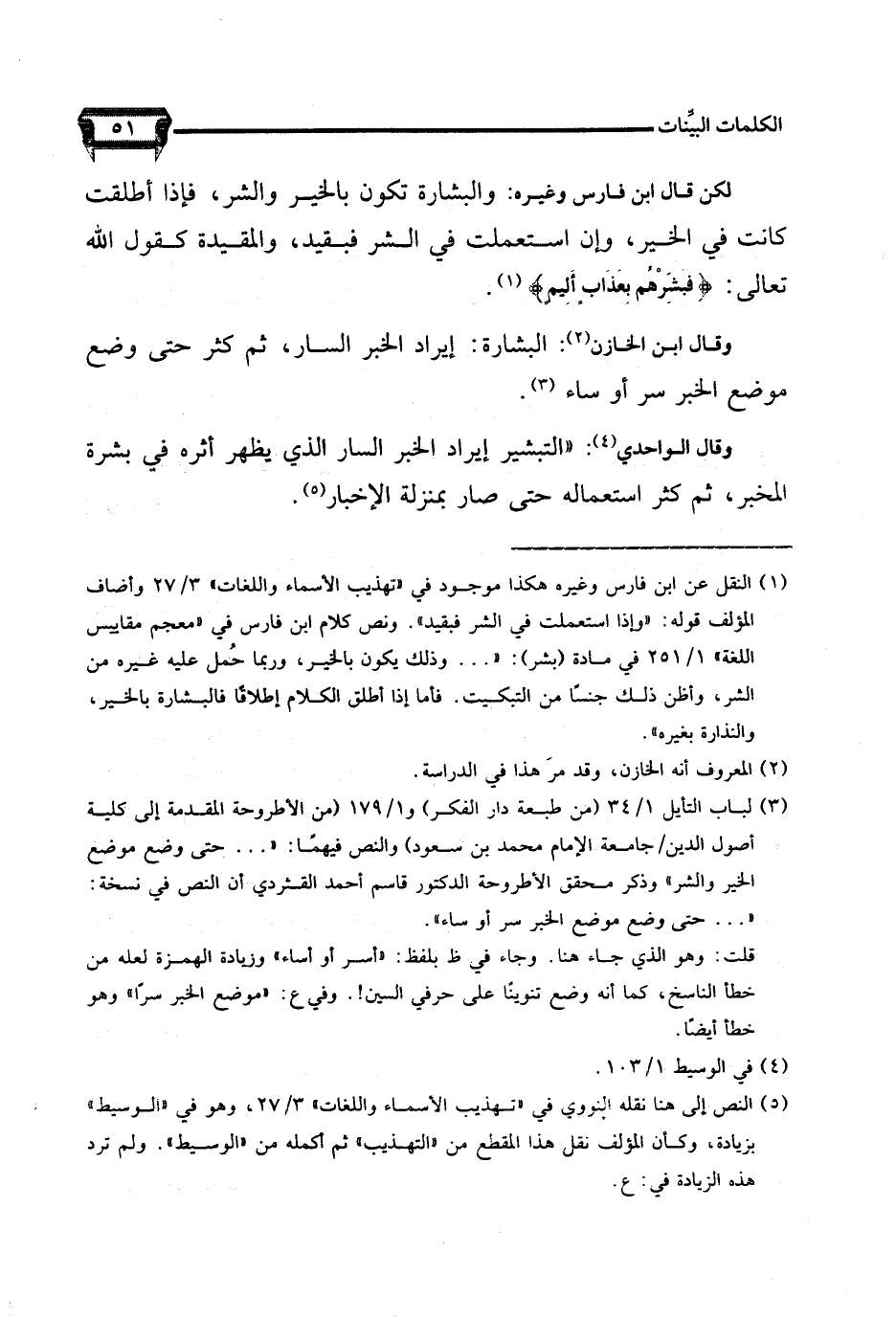 لكن قال ابن فارس وغيره: والبشارة تكون بالخير والشر، فإذا أطلقت كانت في الخير، وإن استعملت في الشر فبقيد، والمقيدة كقول الله تعالى: {فَبَشِّرْهُم بِعَذَابٍ أَلِيمٍ}.