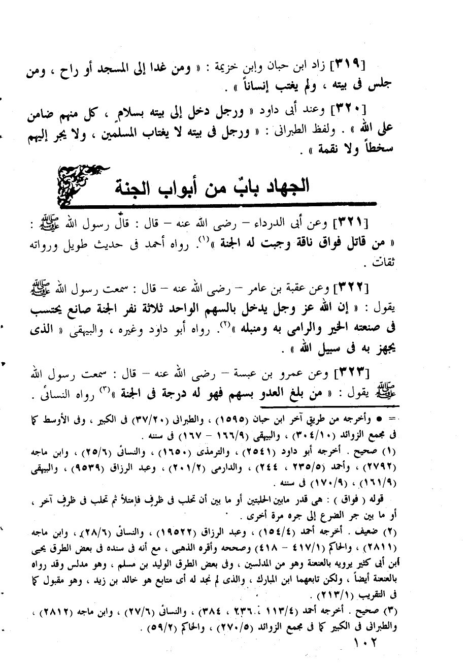 الجهاد باب من أبواب الجنة وعن أبي الدرداء - رضي الله عنه - قال: قال رسول الله صلى الله عليه وسلم: (من قاتل فواق ناقة وجبت له الجنة) رواه أحمد في حديث طويل ورواته ثقات.