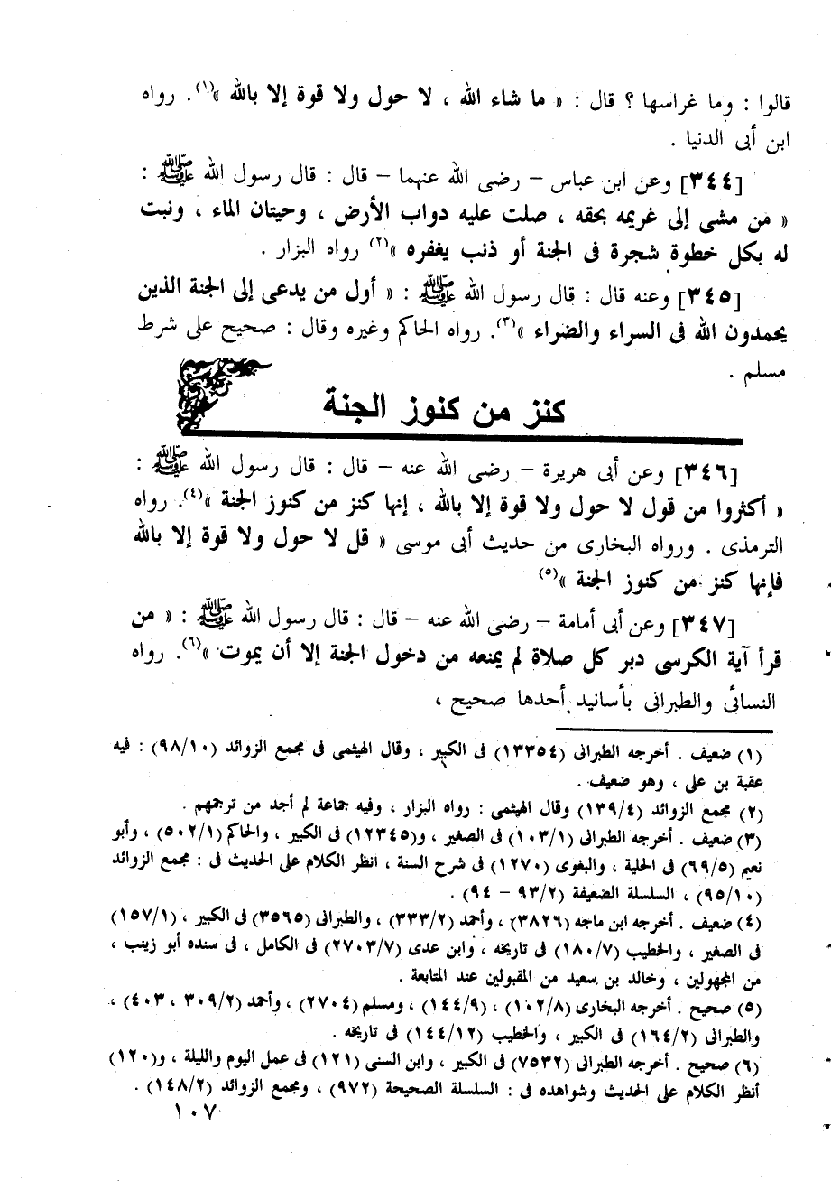 وعن أبي هريرة - رضي الله عنه - قال: قال رسول الله صلى الله عليه وسلم: (أكثروا من قول لا حول ولا قوة إلا بالله، إنها كنز من كنوز الجنة) . رواه الترمذي. ورواه البخاري من حديث أبي موسى (قل لا حول ولا قوة إلا بالله فإنها كنز من كنوز الجنة) .