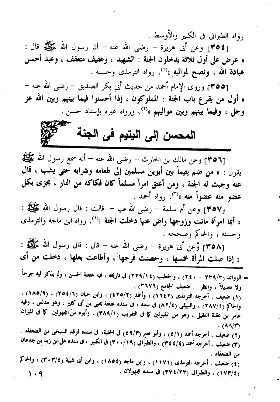 وعن مالك بن الحارث - رضي الله عنه - أنه سمع رسول الله صلى الله عليه وسلم يقول: (من ضم يتيما بين أبوين مسلمين إلى طعامه وشرابه حتى يشب، قال عنه وجبت له الجنة، ومن أعتق امرأ مسلما كان فكاكاه من النار، يجزى بكل عضو منه عضوا منه) رواه أحمد.