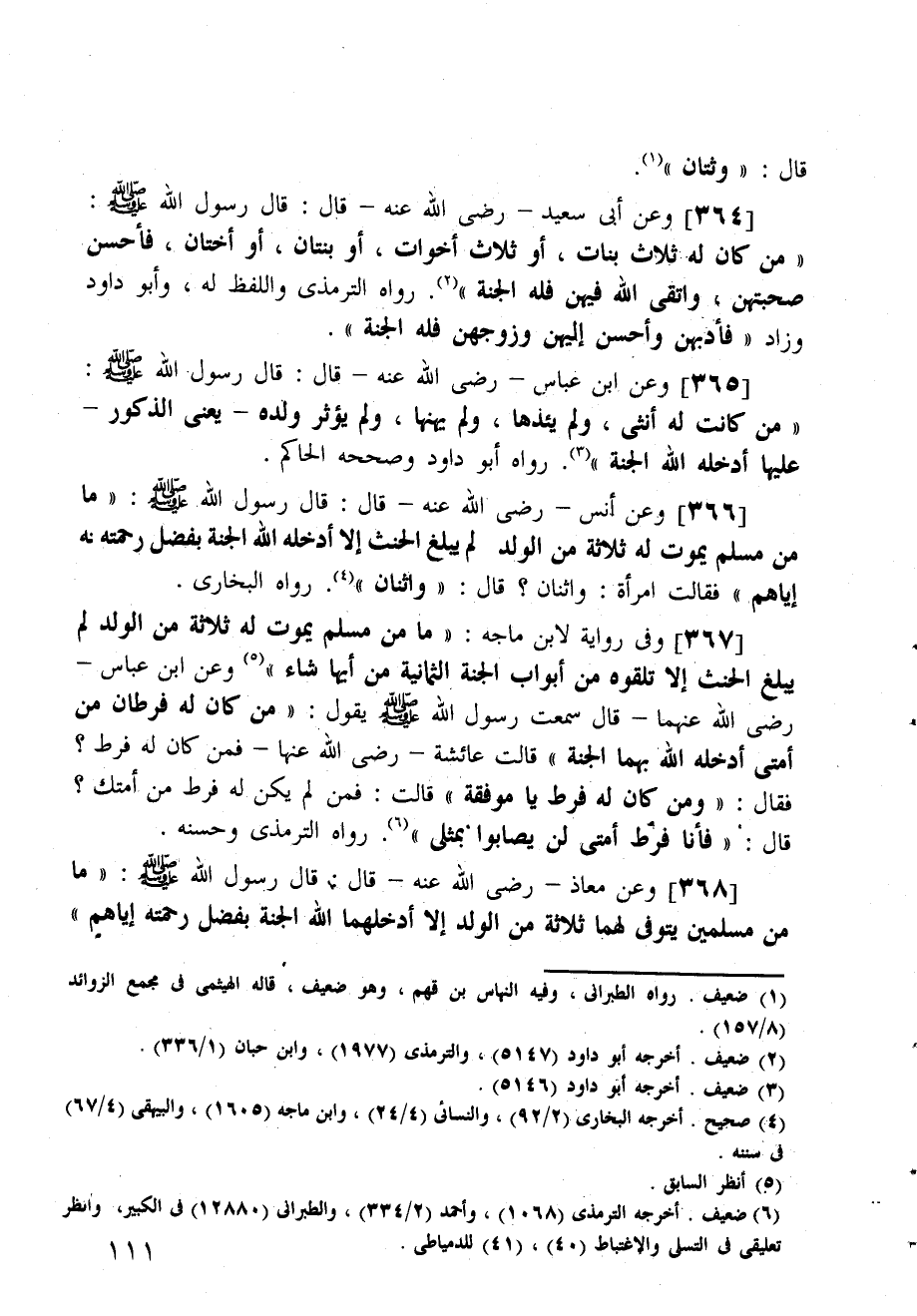 وعن معا - رضي الله عنه - قال: قال رسول الله صلى الله عليه وسلم: (ما من مسلمين يتوفى لهما ثلاثة من الولد غلا أدخلهما الله الجنة بفضل رحمته إياهم)