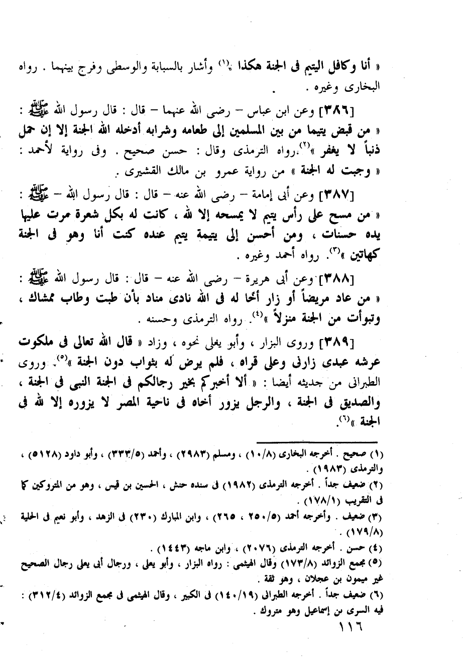 وعن ابن عباس - رضي الله عنهما - قال: قال رسول الله صلى الله عليه وسلم: (من قبض يتيما من بين المسلمين إلى طعامه وشرابه أدخله الله الجنة إلا إن حمل ذنبا لا يغفر) رواه الترمذي وقال: حسن صحيح. وفي رواية لأحمد: (وجبت له الجنة) من رواية عمرو بن مالك القشيري.