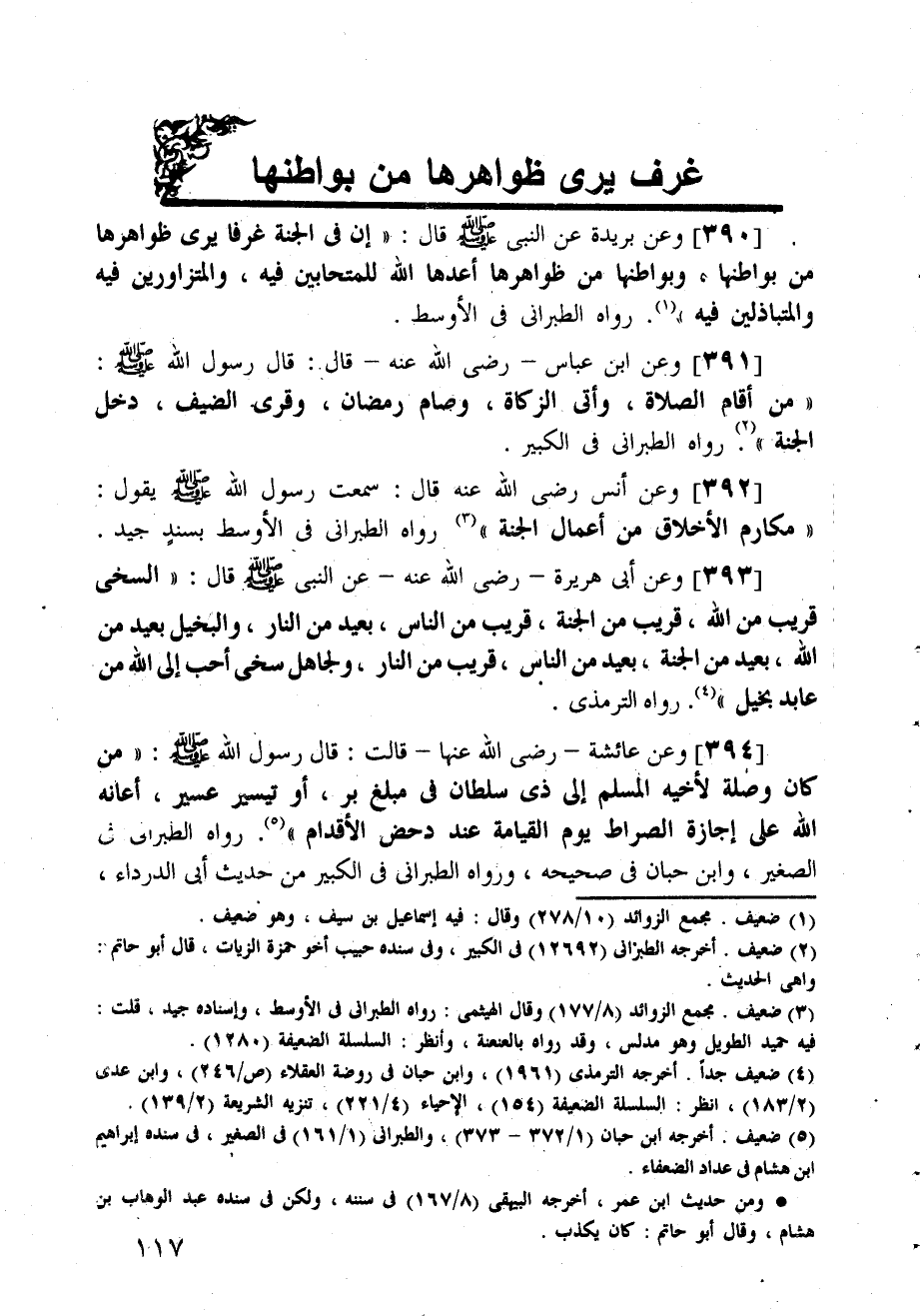 وعن بريدة عن النبي صلى الله عليه وسلم قال: (إن في الجنة غرفا يرى ظواهرها من بواطنها، وبواطنها من ظواهرها أعدها الله للمتحابين فيه، والمتزاورين فيه والمتباذلين فيه) رواه الطبراني في الأوسط.